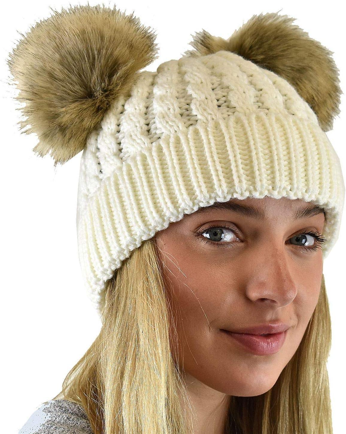 imageCC 2 Ear Pom Pom Cable Knit Soft Stretch Cuff Skully Beanie HatFaux Fur Ivory