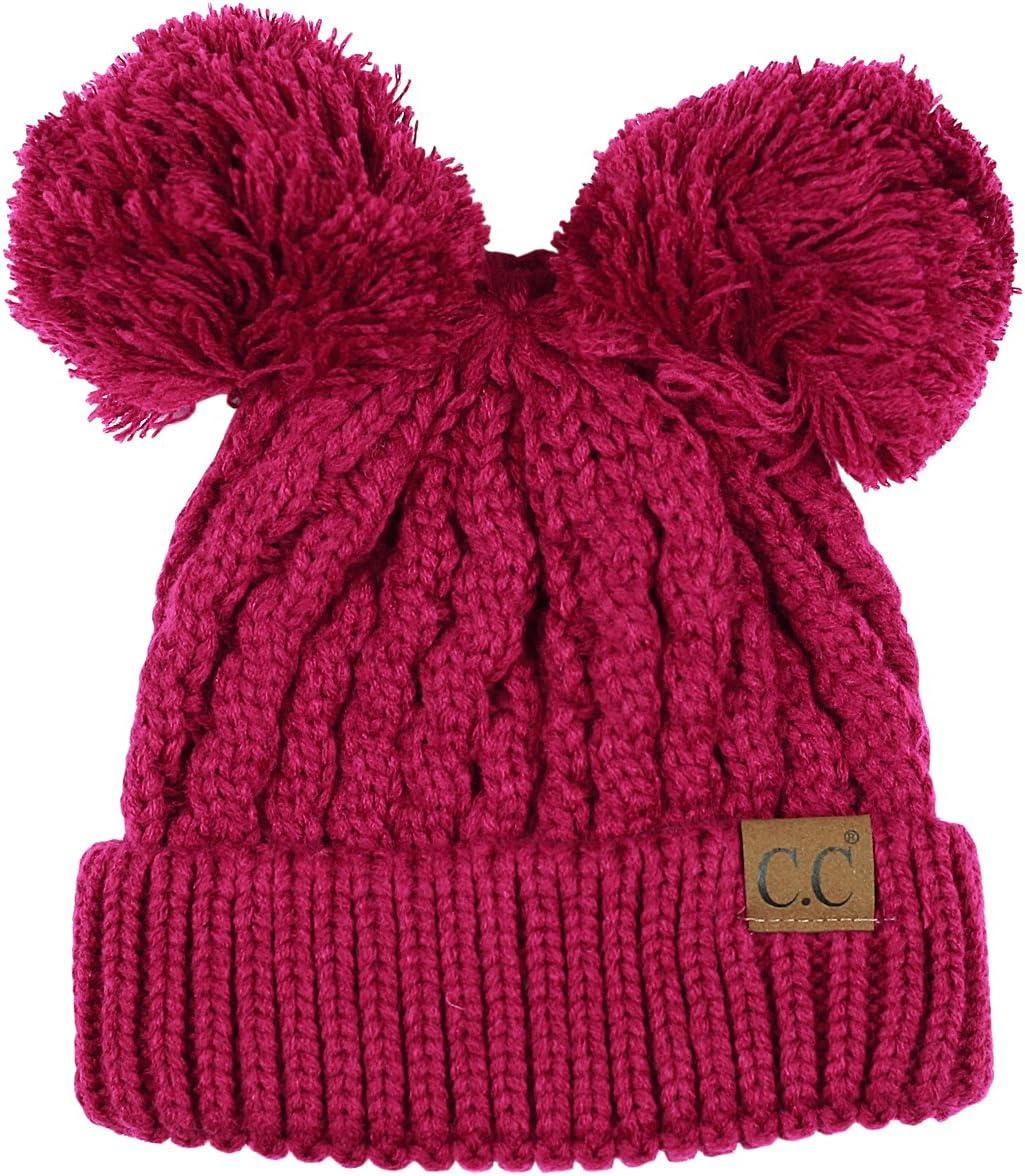 C.C 2 Ear Pom Pom Cable Knit Soft Stretch Cuff Skully Beanie Hat(Indi Pink)