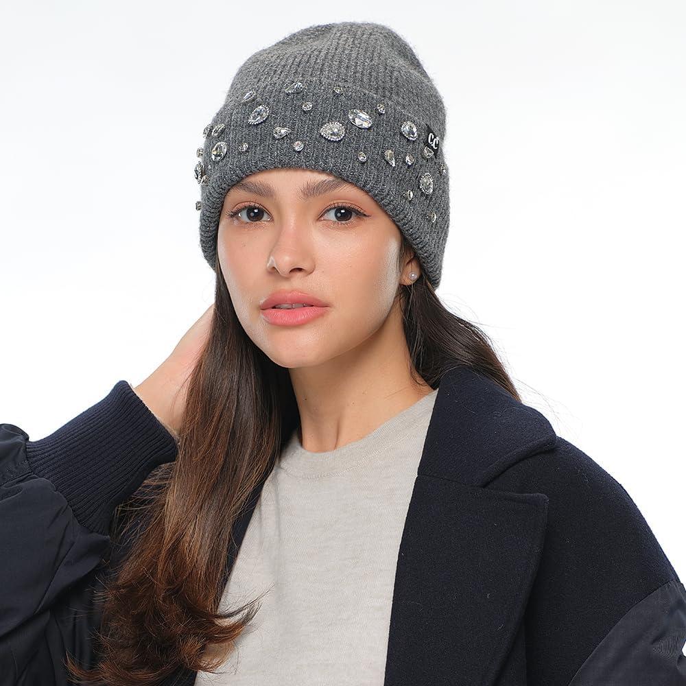 C.C American Flag Rhinestone Beanie for Women Unisex - Sustainable Recycled Yarn Stretchable Soft Warm Knit Winter Skully Hat(Rhinestone-dk Grey)