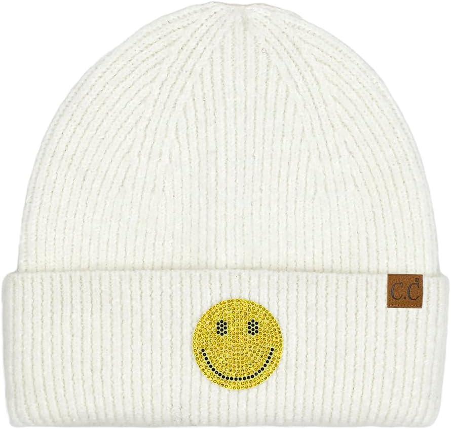 C.C American Flag Rhinestone Beanie for Women Unisex – Sustainable Recycled Yarn Stretchable Soft Warm Knit Winter Skully Hat(Smile-ivory)
