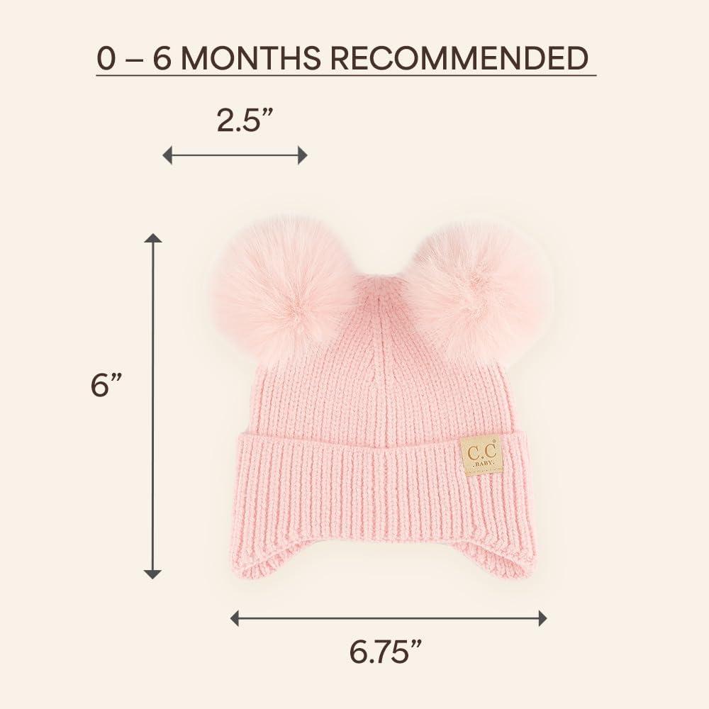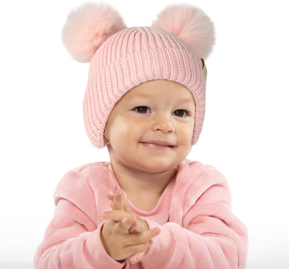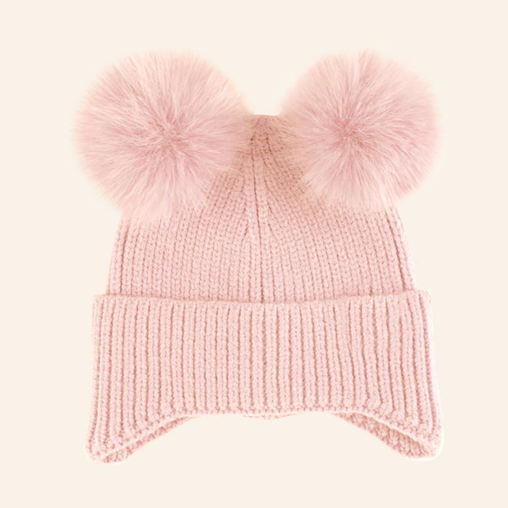 C.C Baby Double Fur Pom Pom Beanie with Ear Flap for Boys Girls - Comfortable Soft Warm Infant Toddler Baby Knit Skully Hat(Pink)