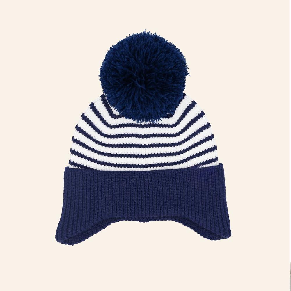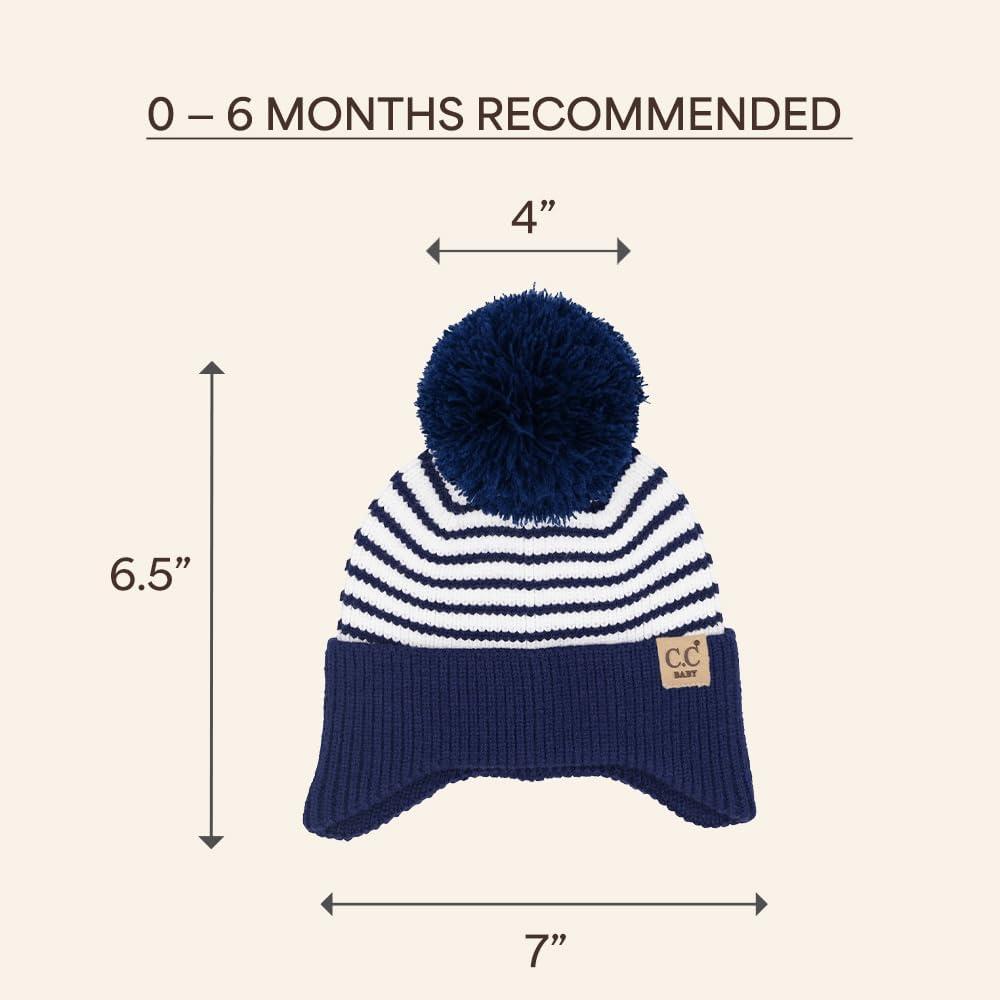 C.C Baby Double Fur Pom Pom Beanie with Ear Flap for Boys Girls - Comfortable Soft Warm Infant Toddler Baby Knit Skully Hat(Stripes - Navy)