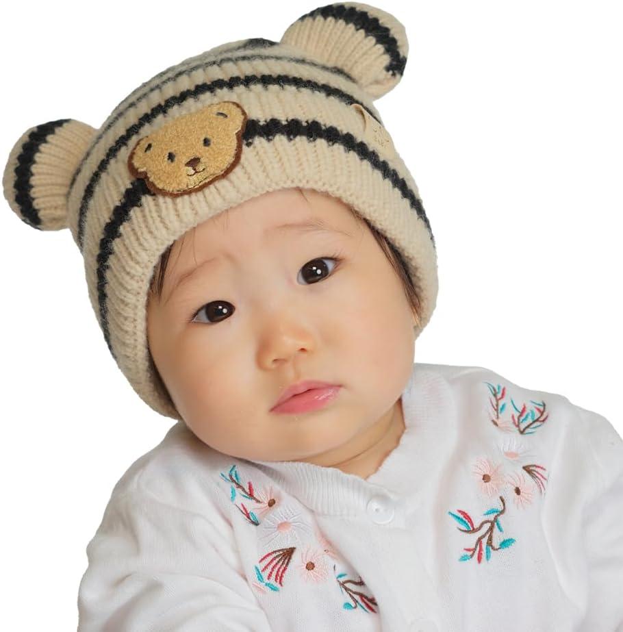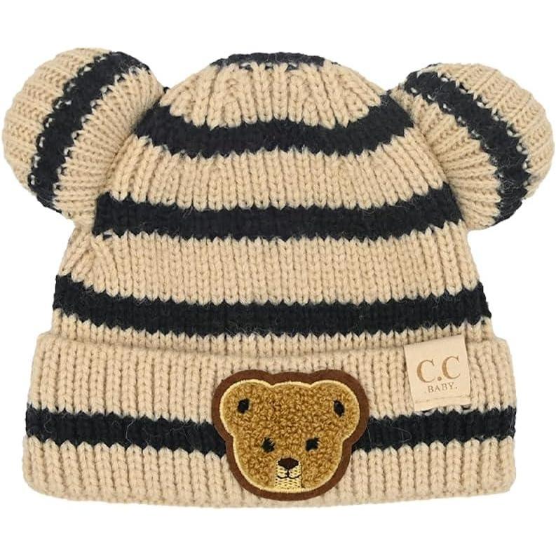 C.C Baby Teddy Bear Ear Beanie for Boys Girls- Comfortable Soft Warm Infant Baby Knit Skully Hat(Teddy Stripe Beige)