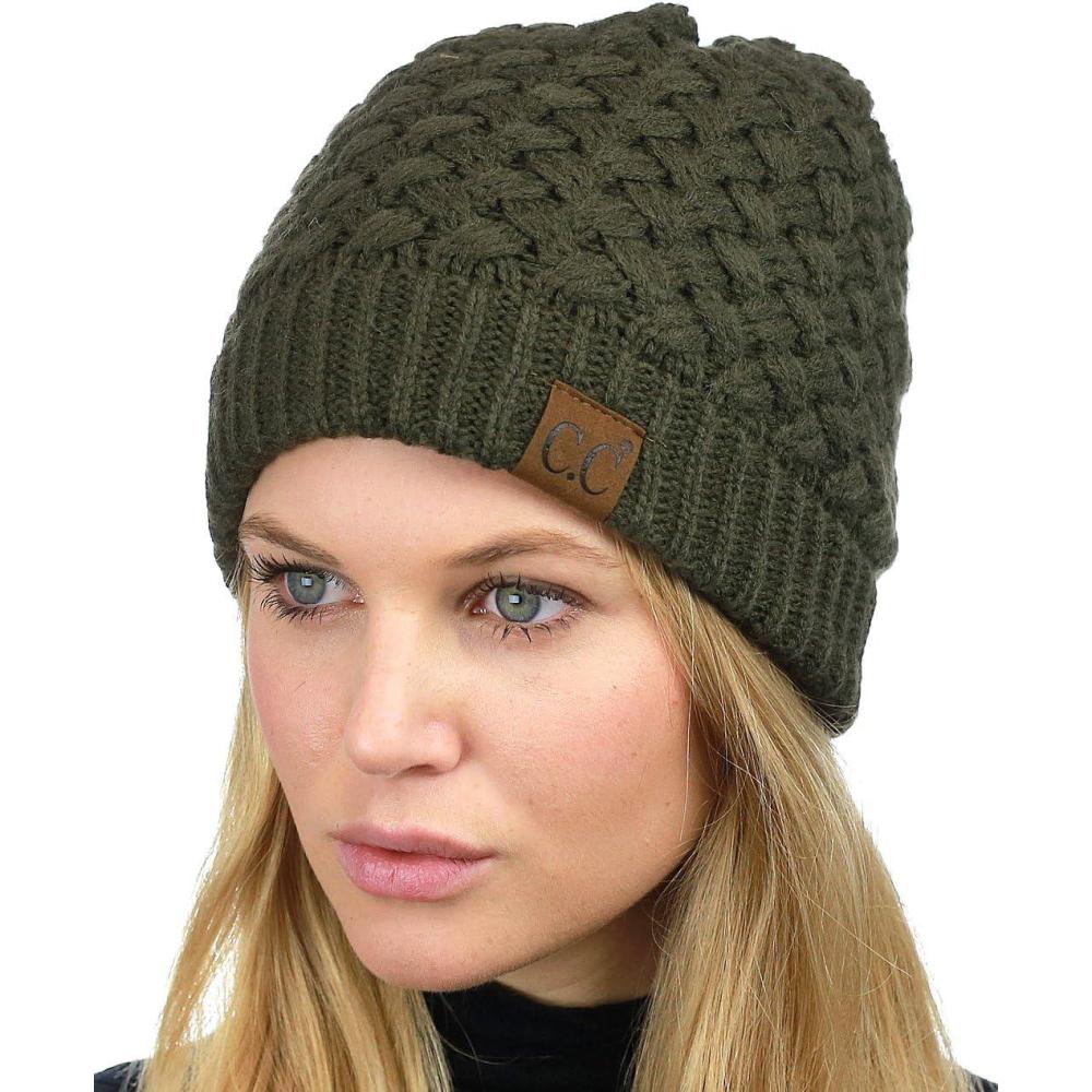imageCC Basketweave Knit Warm Inner Lined Soft Stretch Skully Beanie HatDark Olive