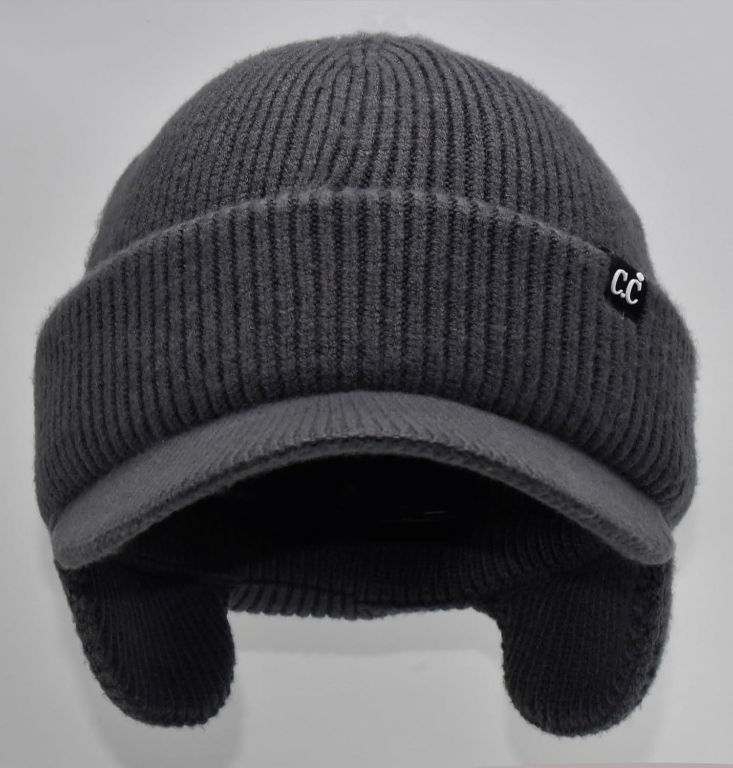 C.C Beanie Strechy Snug Fit Soft Knit Hat with Visor Brim & Ear Warmer Flaps(Slate Grey)