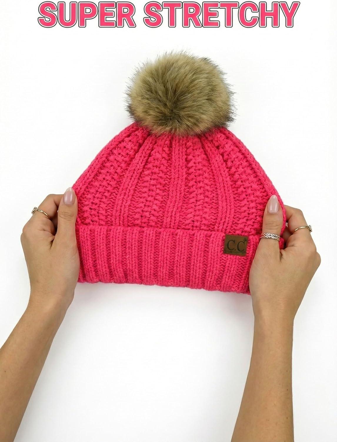 C.C Beanie Women’s Cozy Chenille Pom Hat — Warm Fashionable Soft Touch Winter Beanie(Hot Pink)