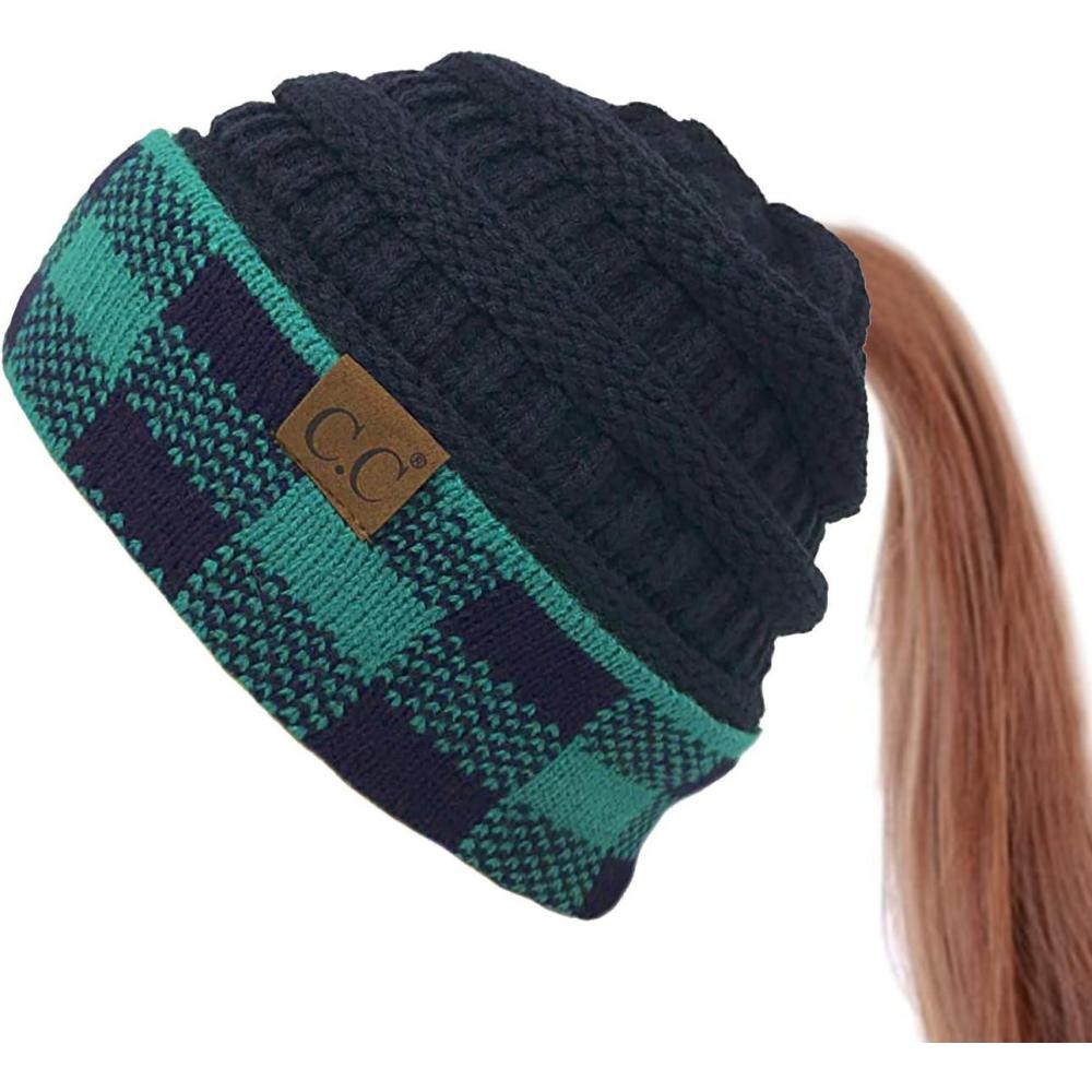 imageCC BeanieTail Cable Knit Messy High Bun Ponytail Cuff Beanie HatBuffalo Checkered Hunter GreenNavy