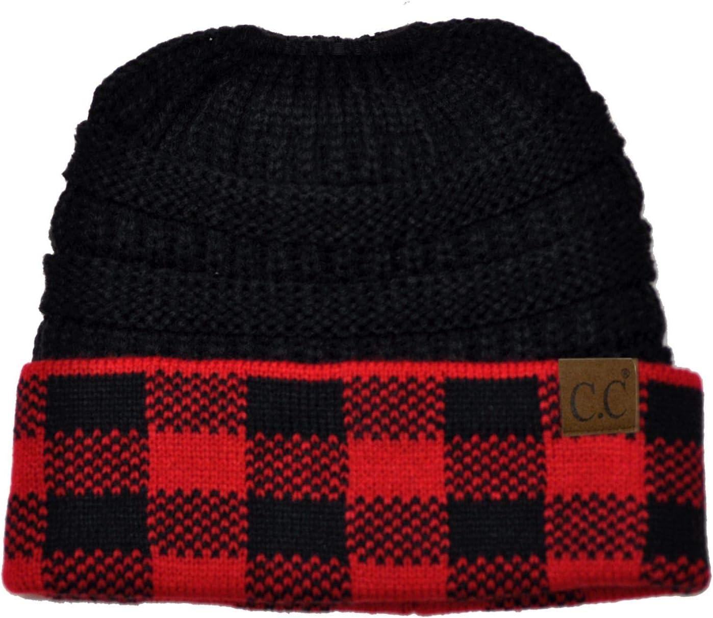 C.C BeanieTail Cable Knit Messy High Bun Ponytail Cuff Beanie Hat(Buffalo Checkered Red/Black)