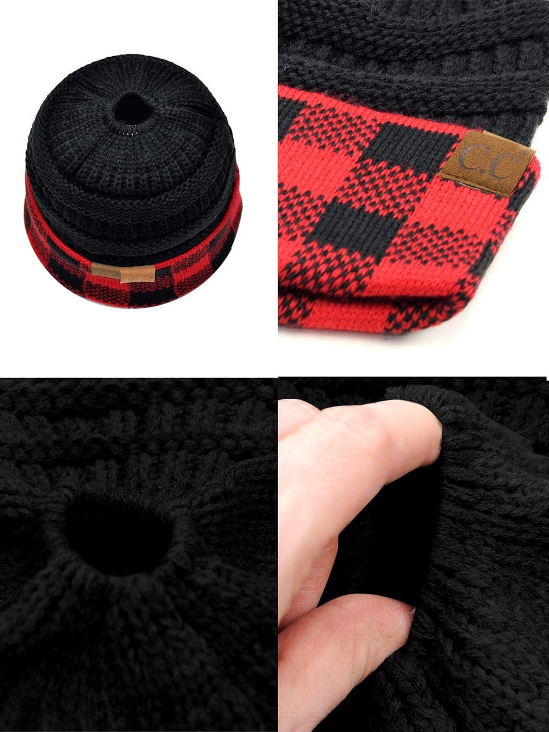 imageCC BeanieTail Cable Knit Messy High Bun Ponytail Cuff Beanie HatBuffalo Checkered RedBlack
