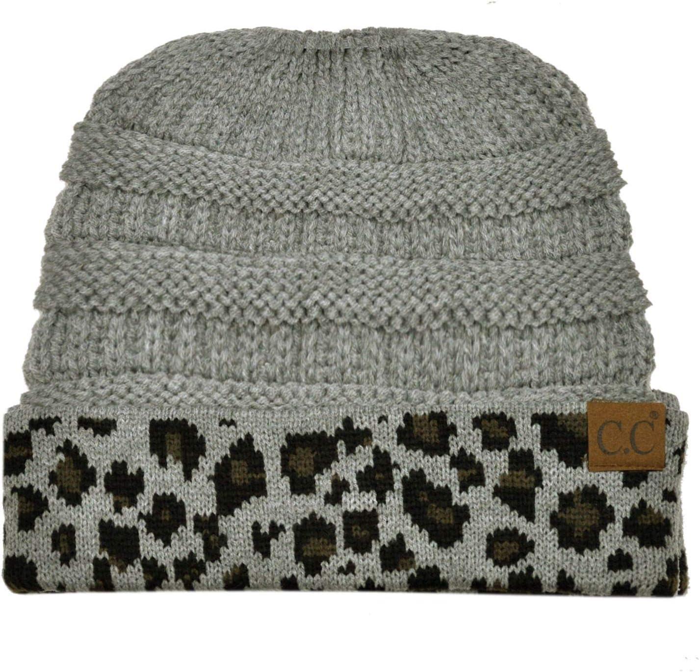C.C BeanieTail Cable Knit Messy High Bun Ponytail Cuff Beanie Hat(Leopard Light Melange Gray)