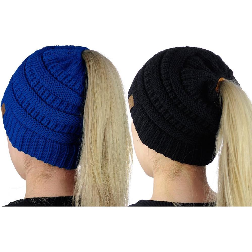 C.C BeanieTail Soft Stretch Cable Knit Messy High Bun Ponytail Beanie Hat, 2 Pack(Black/Royal)