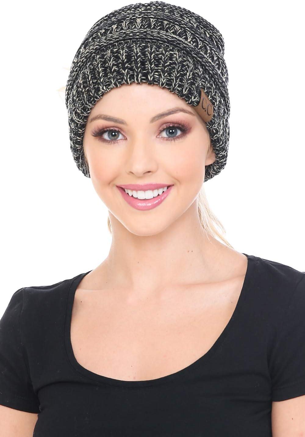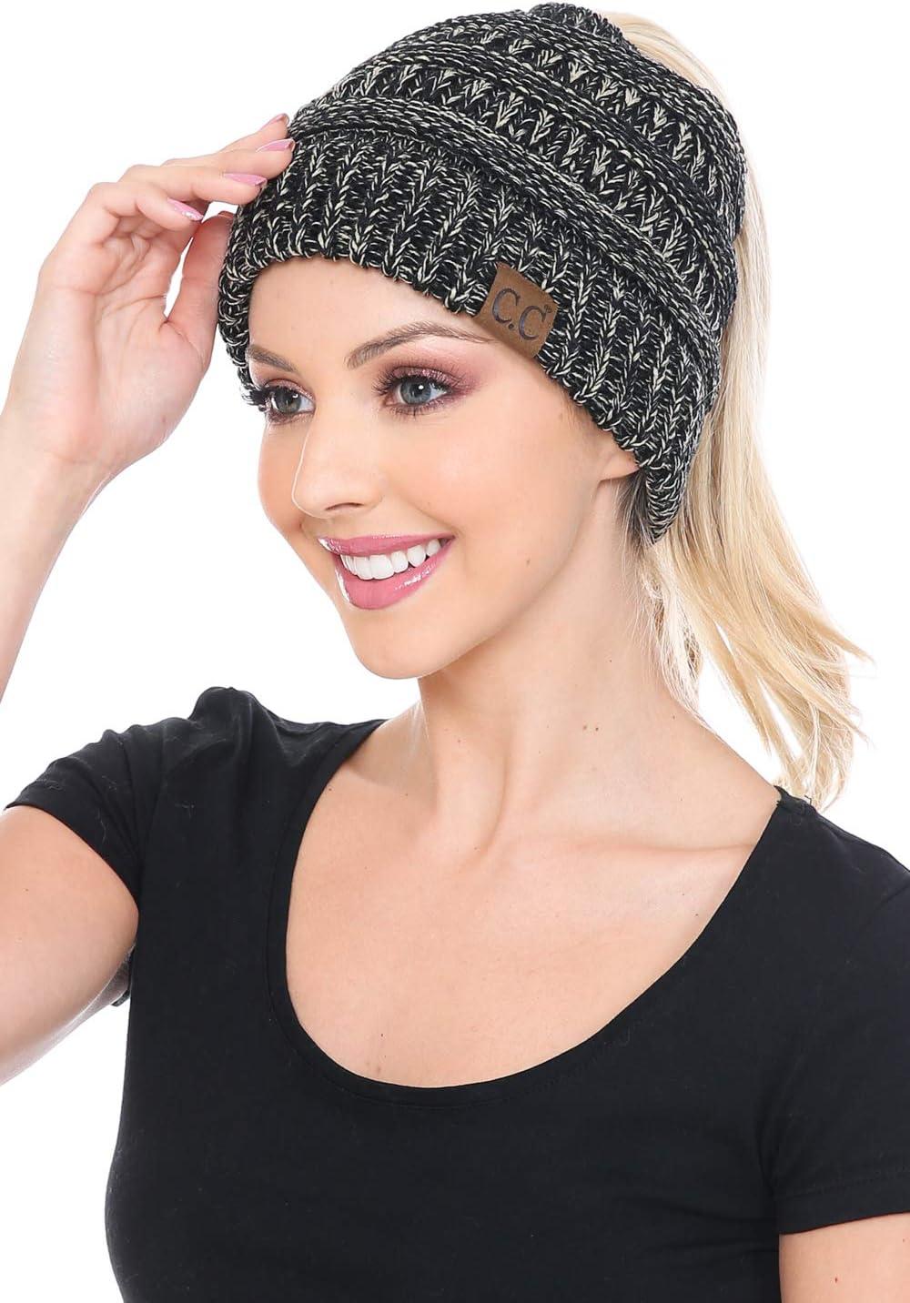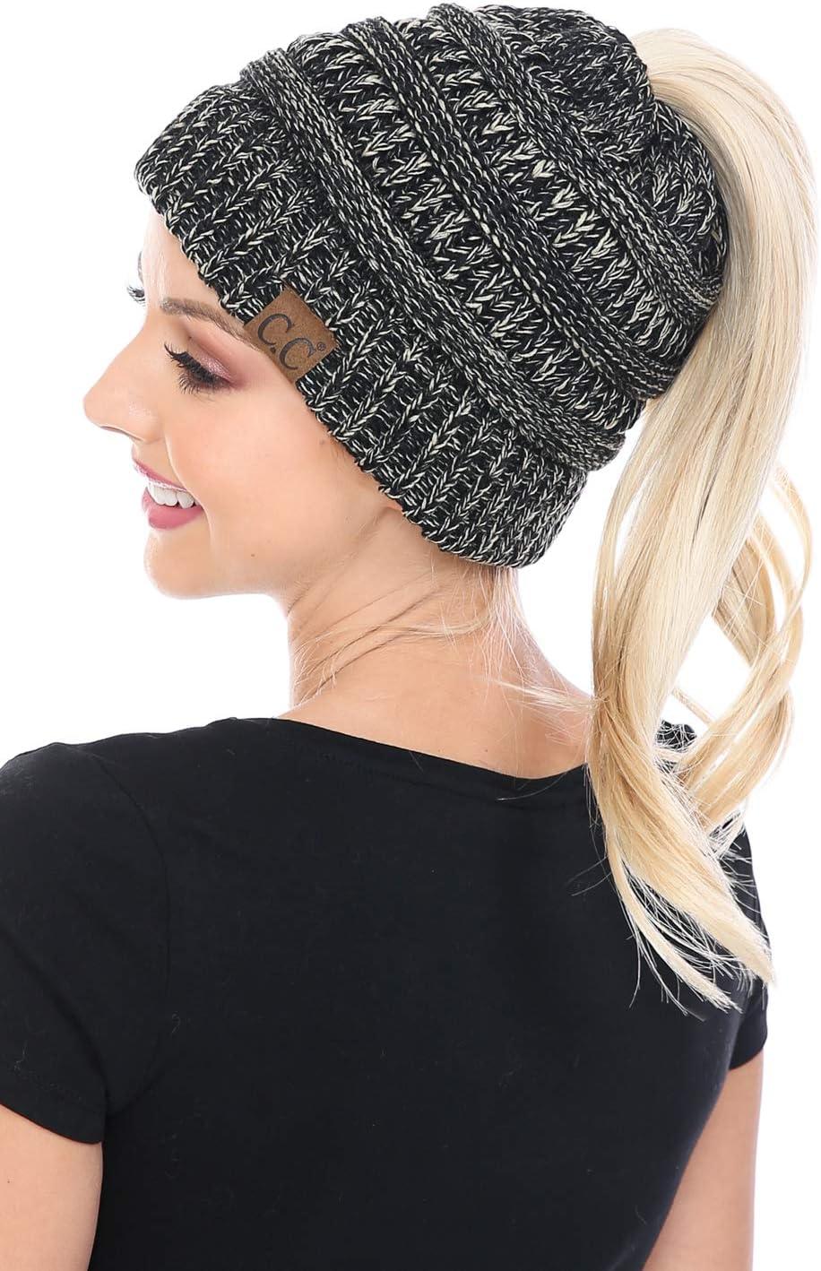 C.C BeanieTail Soft Stretch Cable Knit Messy High Bun Ponytail Beanie Hat(2 Tone Black/Dark Beige)