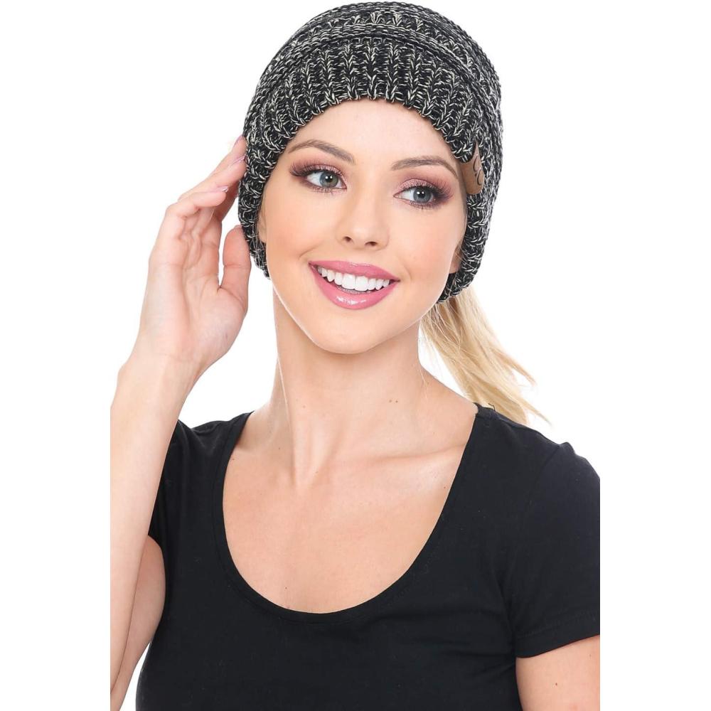imageCC BeanieTail Soft Stretch Cable Knit Messy High Bun Ponytail Beanie Hat2 Tone BlackDark Beige
