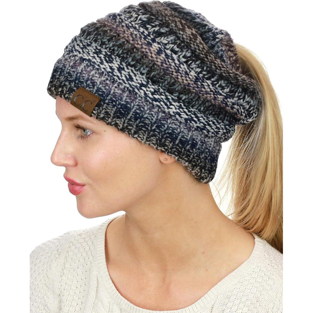 C.C BeanieTail Soft Stretch Cable Knit Messy High Bun Ponytail Beanie Hat(Black/Multi)