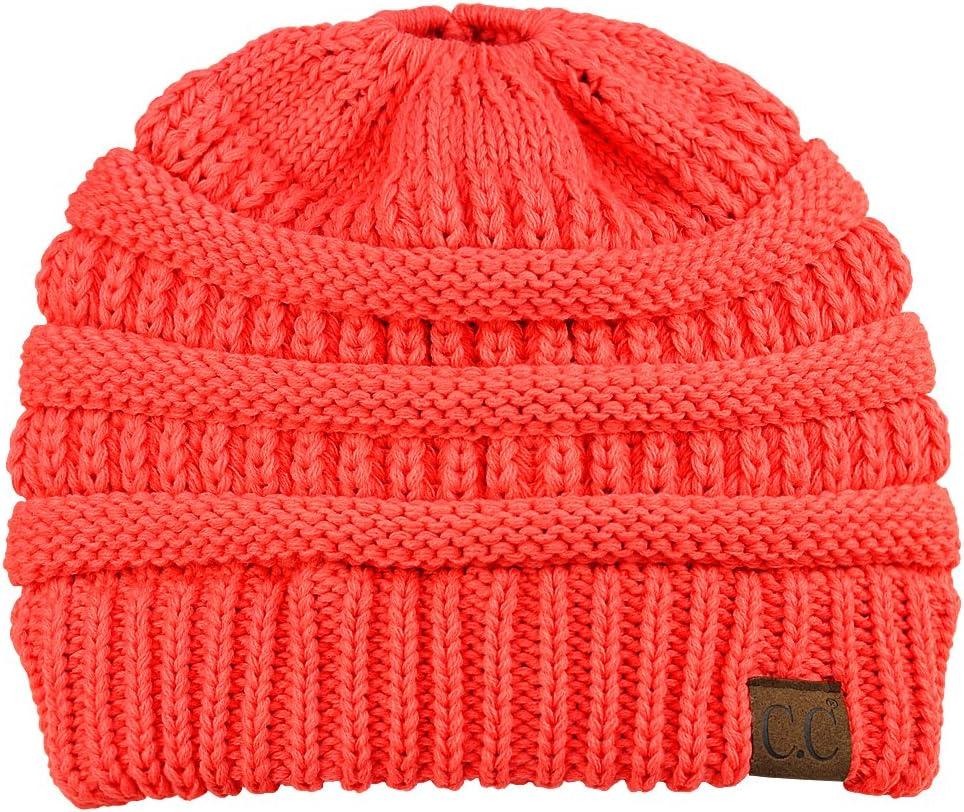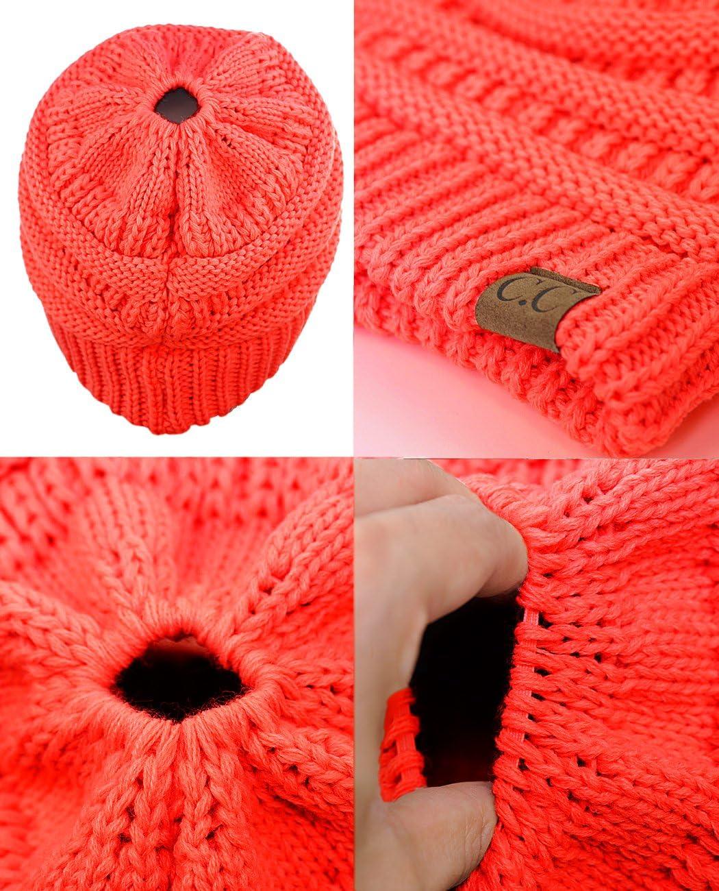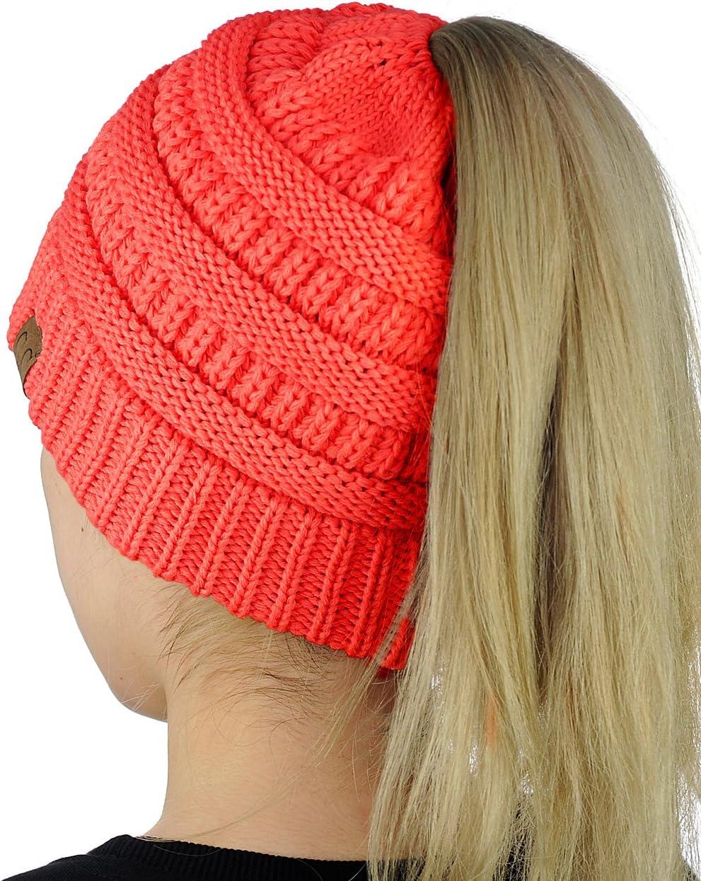 C.C BeanieTail Soft Stretch Cable Knit Messy High Bun Ponytail Beanie Hat(Coral)