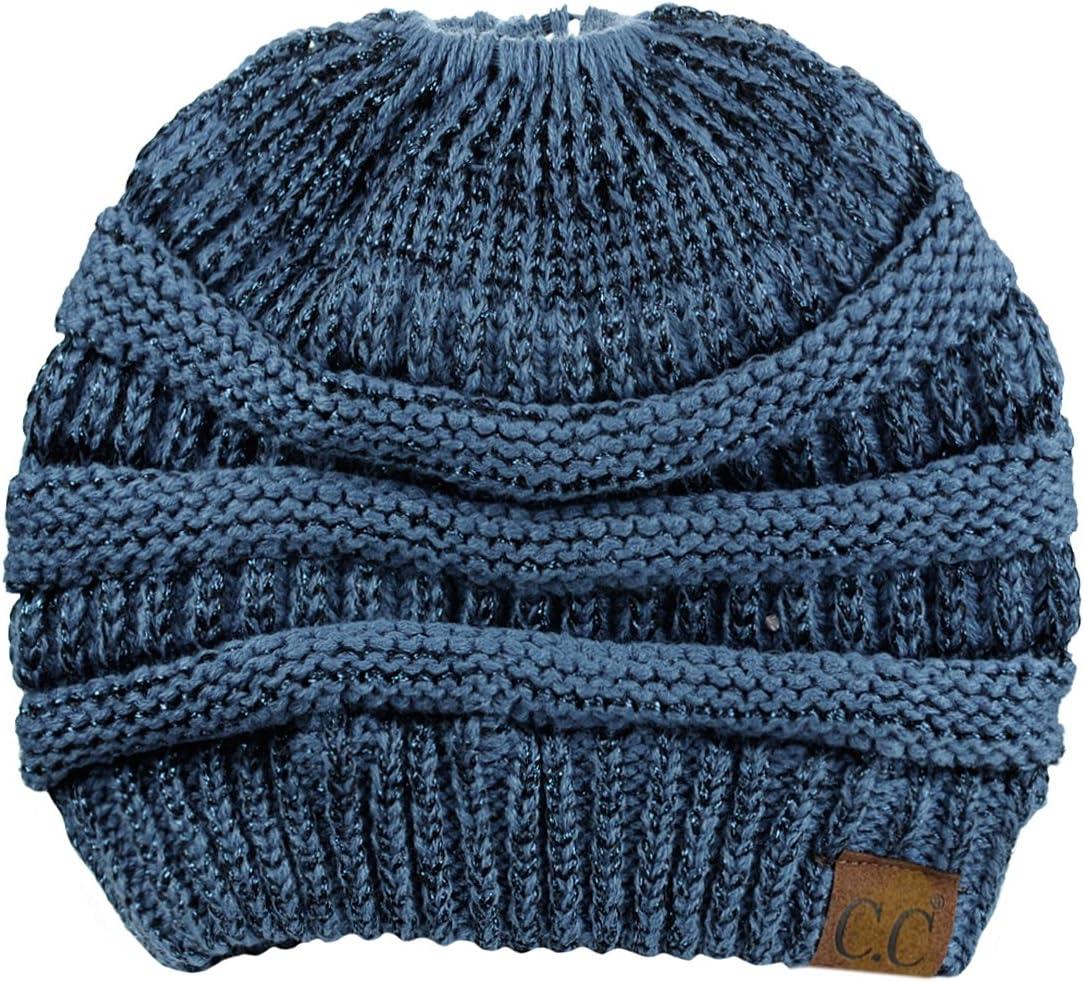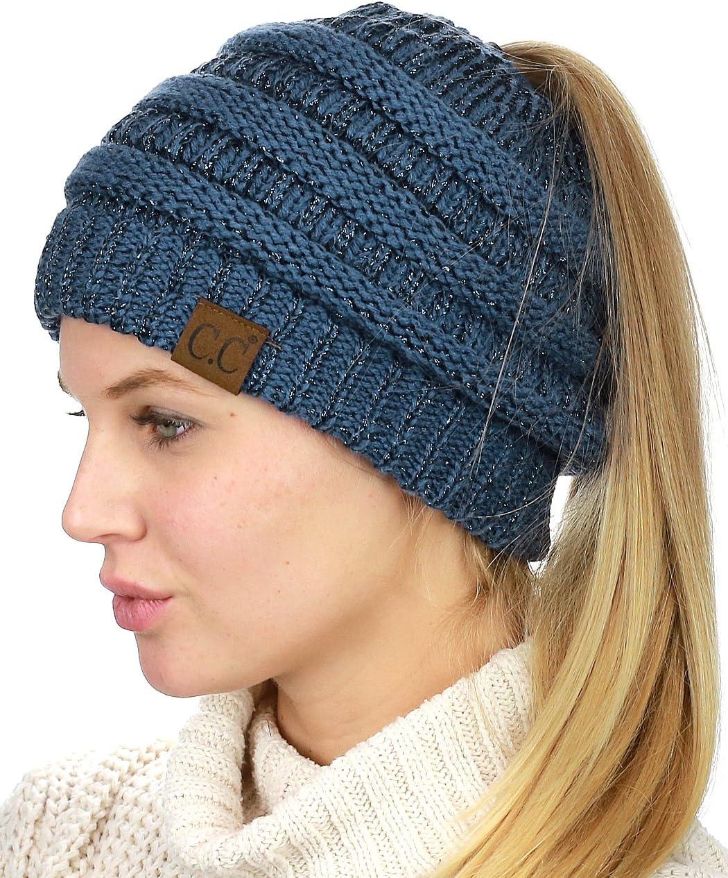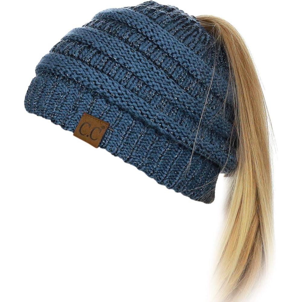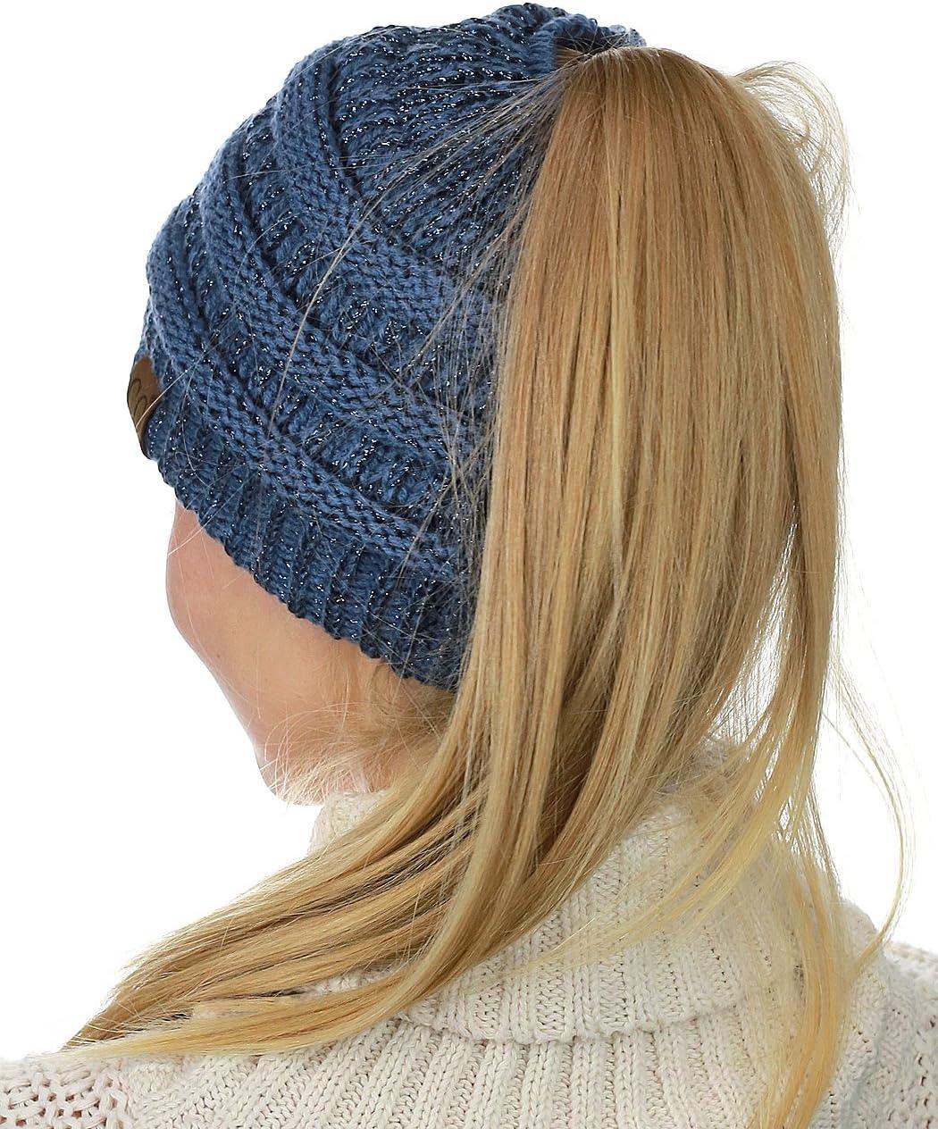 C.C BeanieTail Soft Stretch Cable Knit Messy High Bun Ponytail Beanie Hat(Dark Denim Metallic)