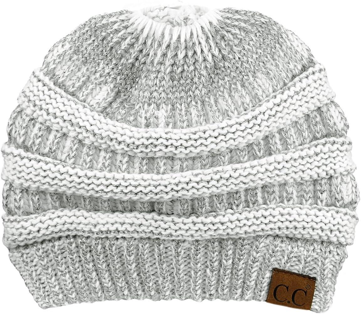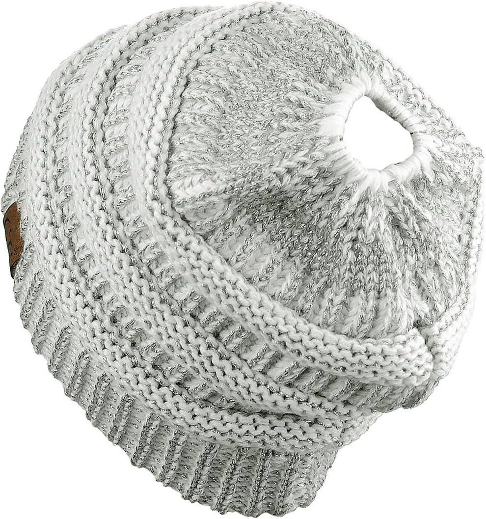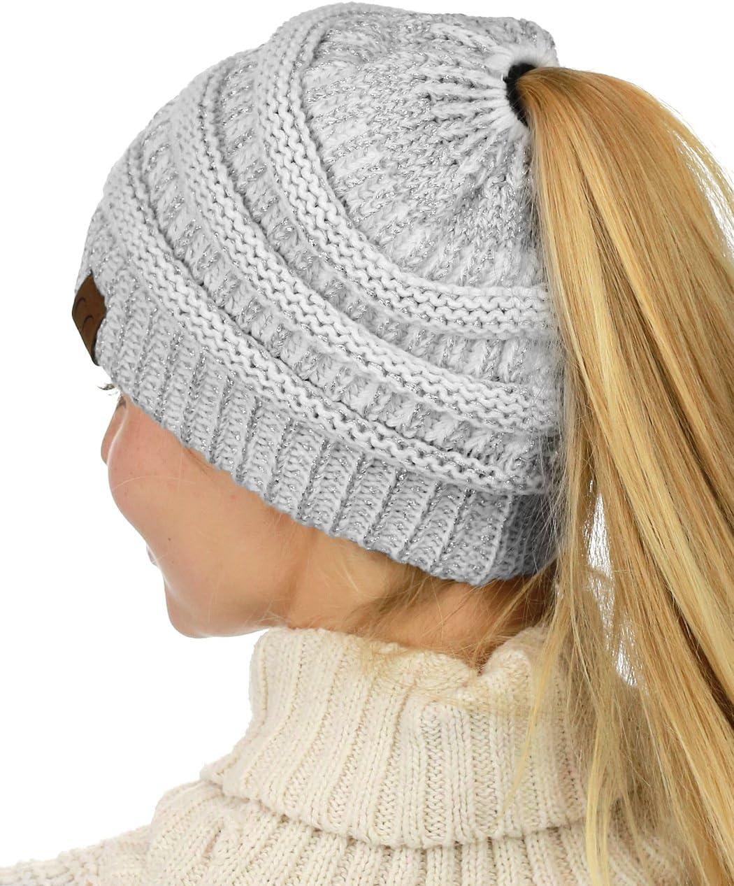 C.C BeanieTail Soft Stretch Cable Knit Messy High Bun Ponytail Beanie Hat(Ivory/Silver Metallic)