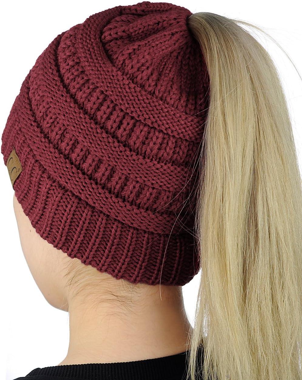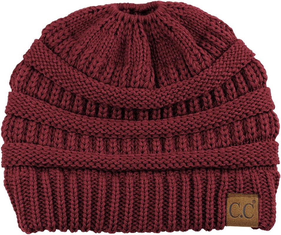 C.C BeanieTail Soft Stretch Cable Knit Messy High Bun Ponytail Beanie Hat(Maroon)