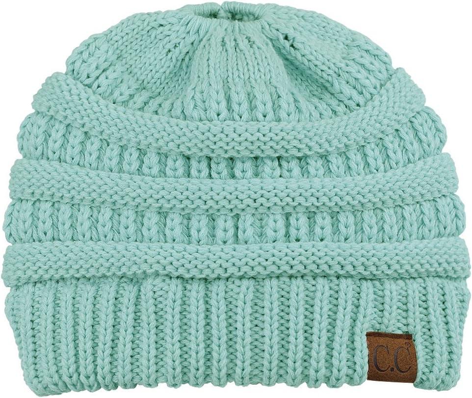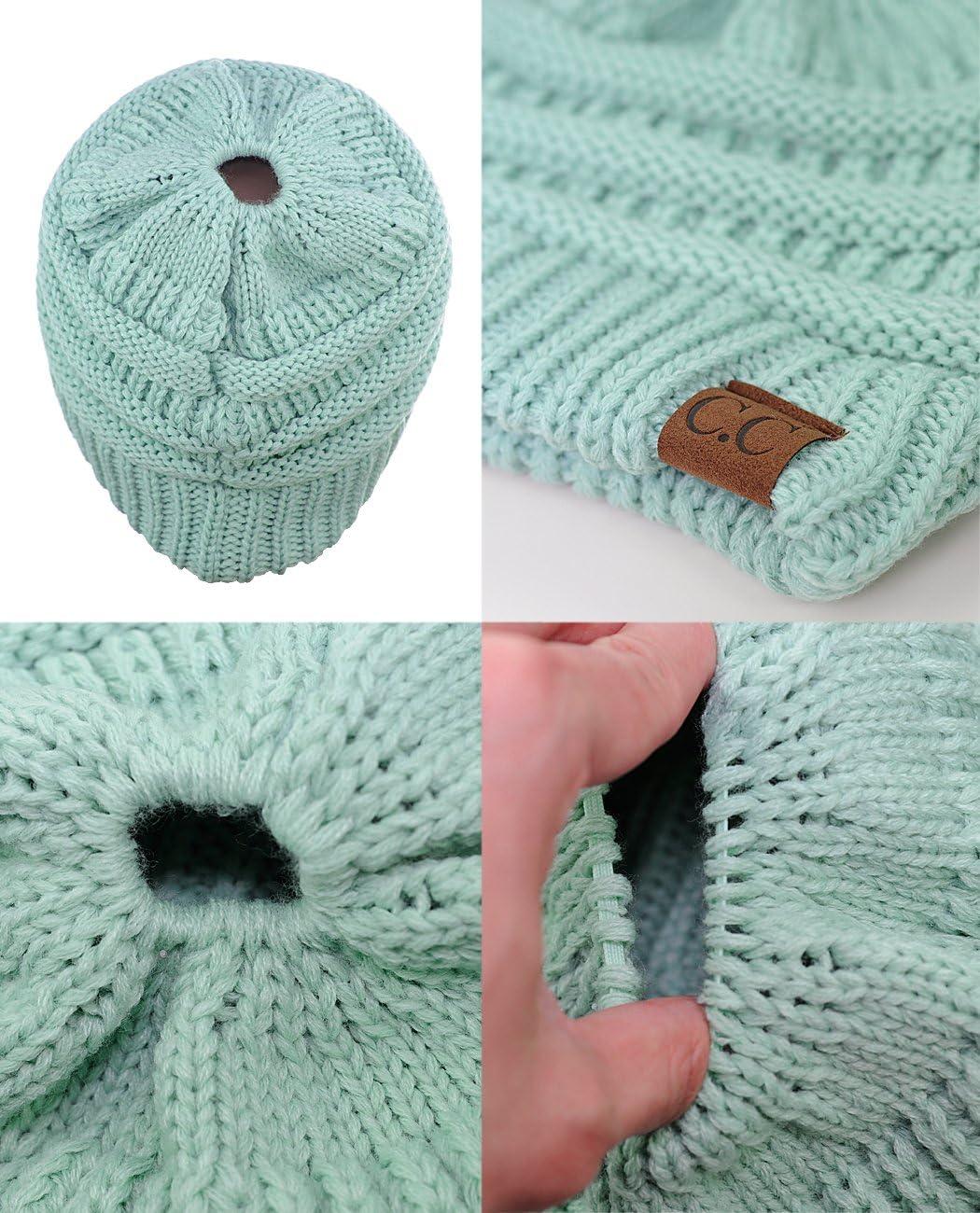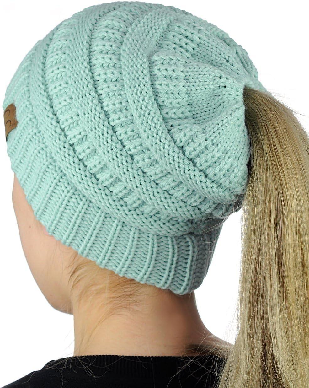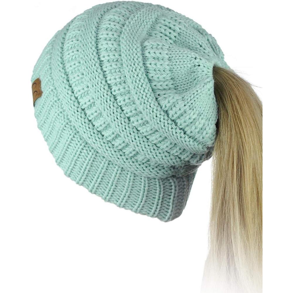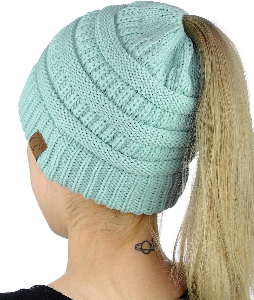C.C BeanieTail Soft Stretch Cable Knit Messy High Bun Ponytail Beanie Hat(Mint)