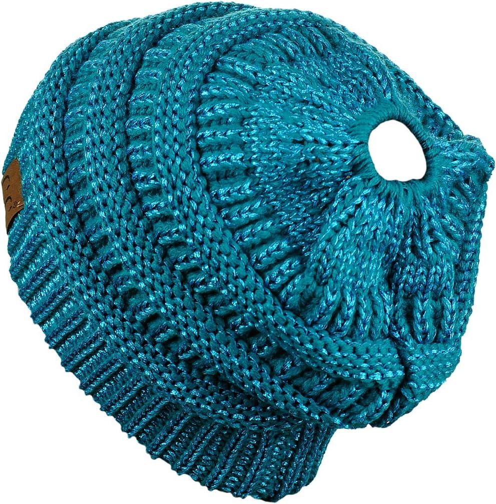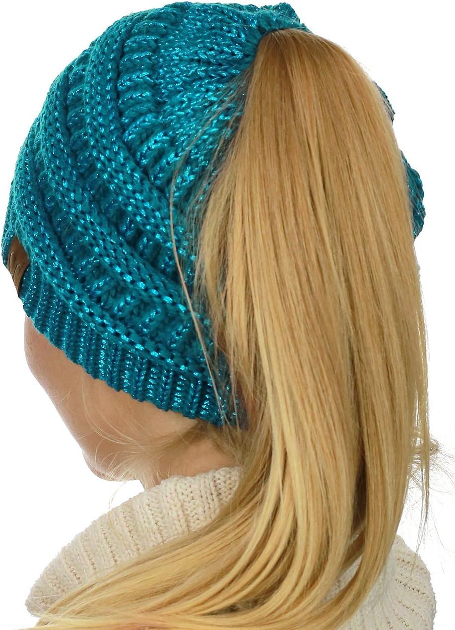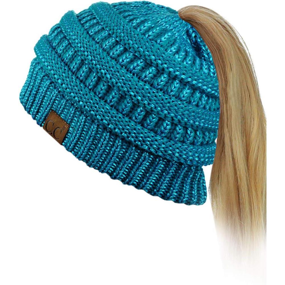 C.C BeanieTail Soft Stretch Cable Knit Messy High Bun Ponytail Beanie Hat(Teal Metallic)