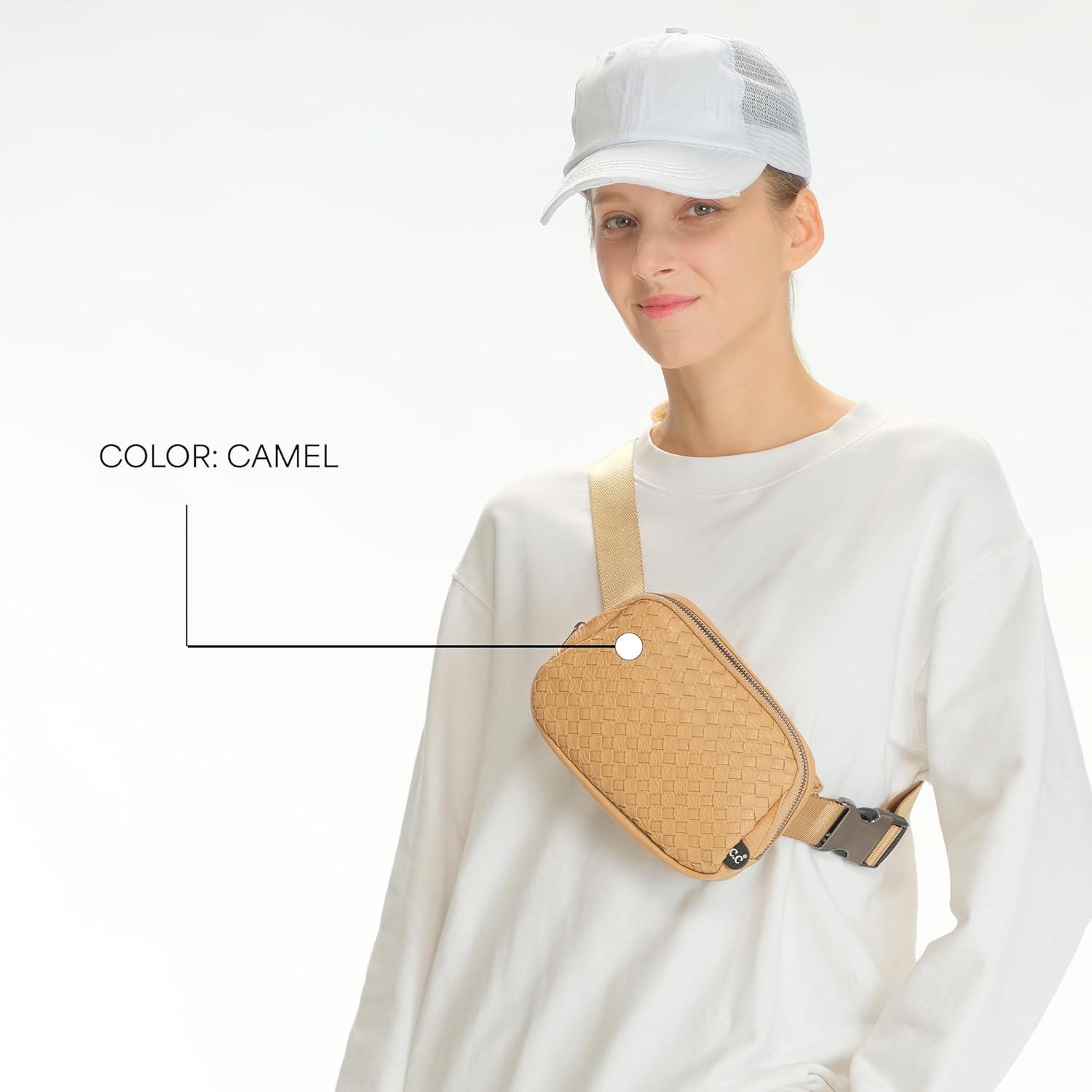 C.C. Belt Bag for Women: Crossbody Fanny Pack with Adjustable Strap – Fashion Waist Pack Gifts (BG-4253) (White)(Vegan Leather Woven – Camel)