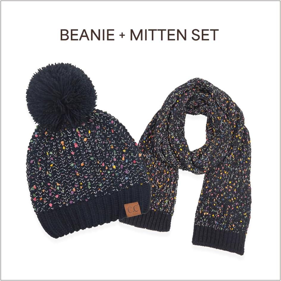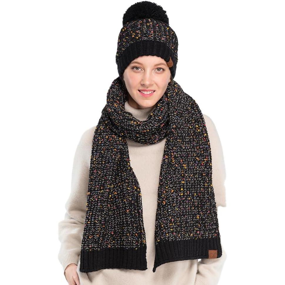 C.C Cable Knit Beanie and Scarf Set, Colorful Confetti Pattern, Winter Accessories(Black)