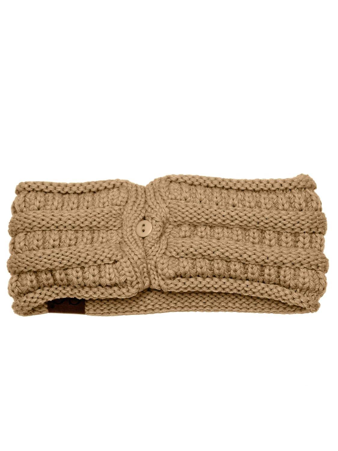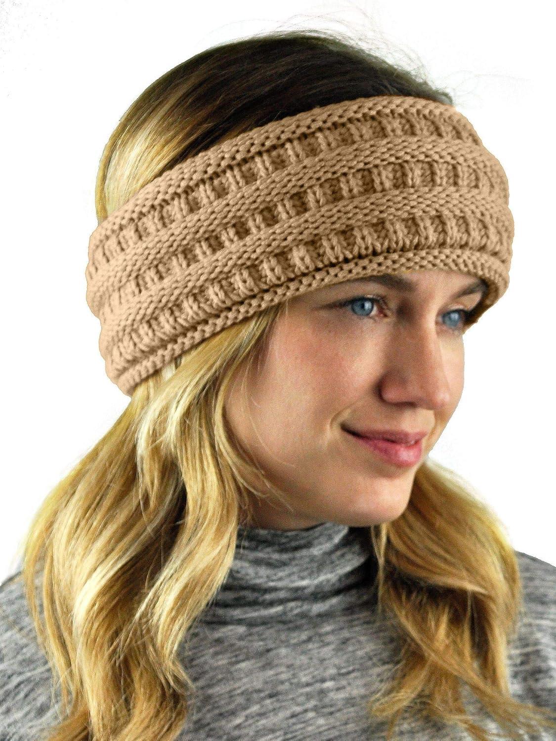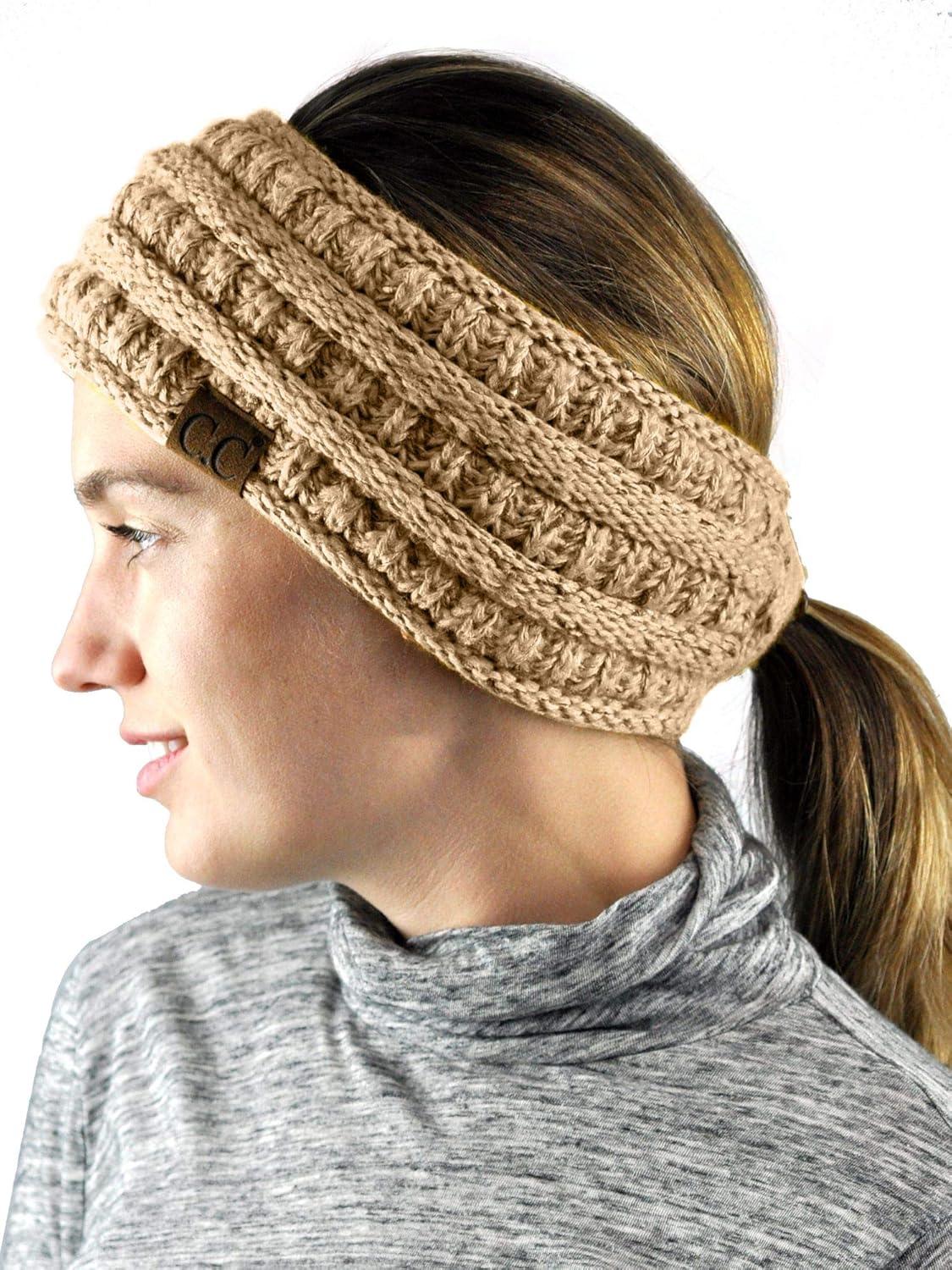 C.C Cable Knit Fuzzy Lined Ear Warmer Ponytail Pony Headband, Black(Camel)