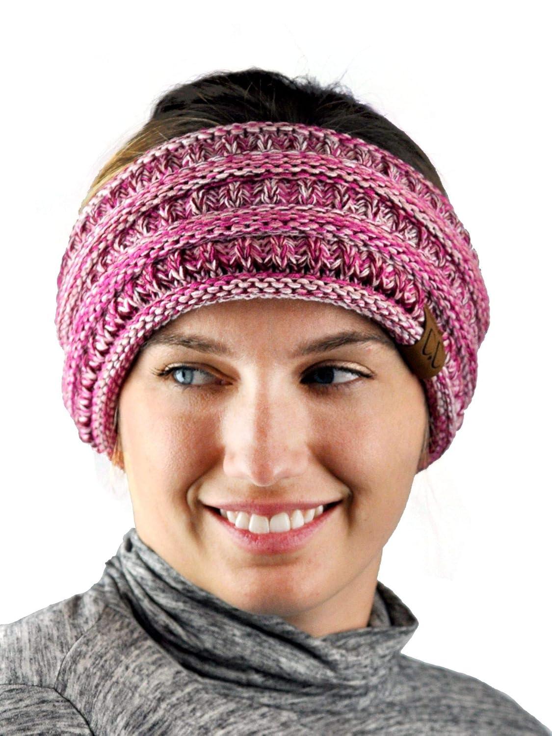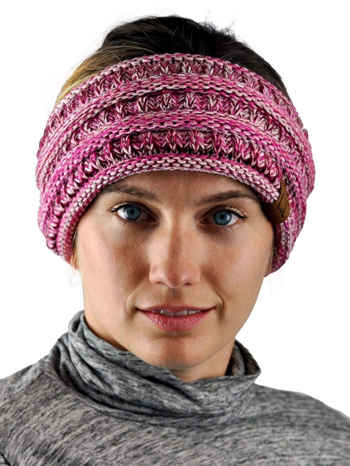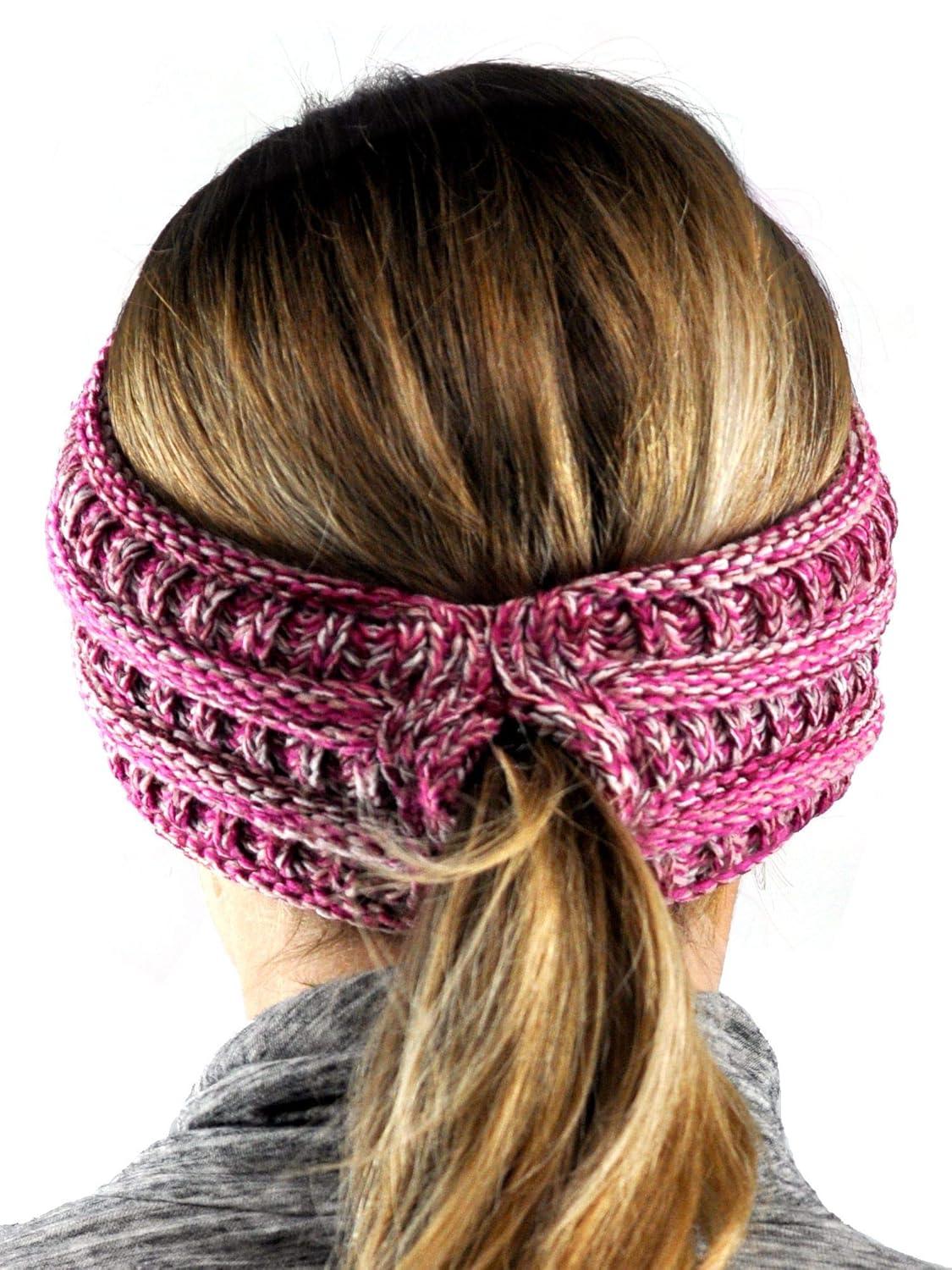 C.C Cable Knit Fuzzy Lined Ear Warmer Ponytail Pony Headband, Black(Candy Pink)