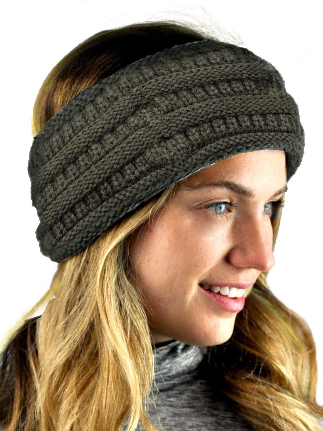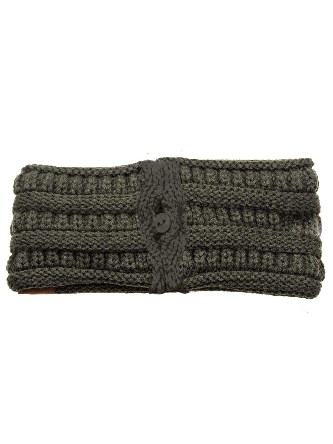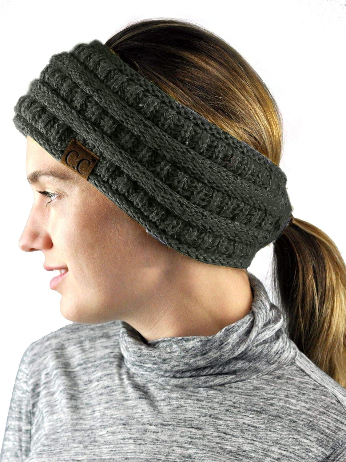 C.C Cable Knit Fuzzy Lined Ear Warmer Ponytail Pony Headband, Black(Dark Olive)