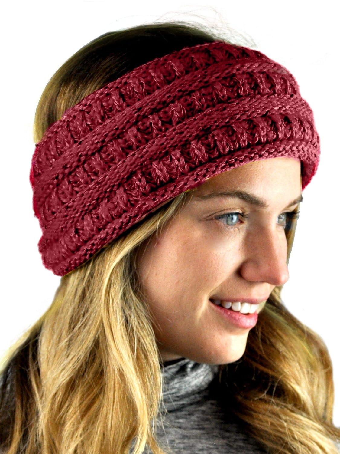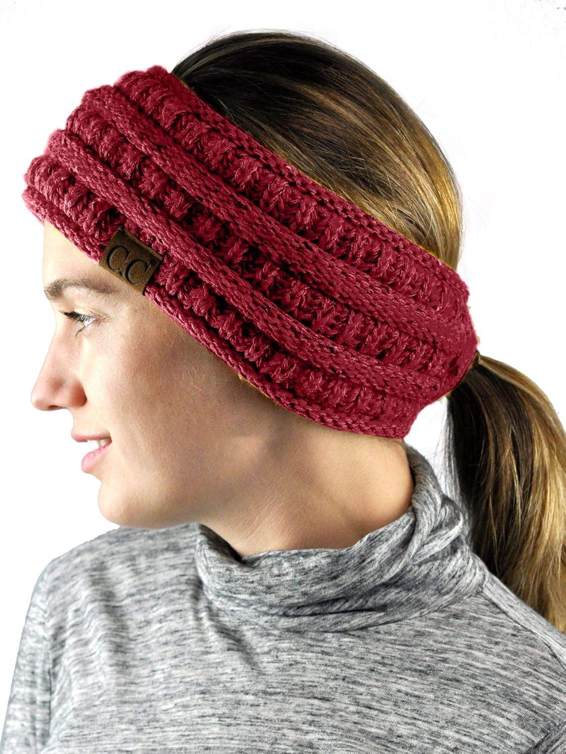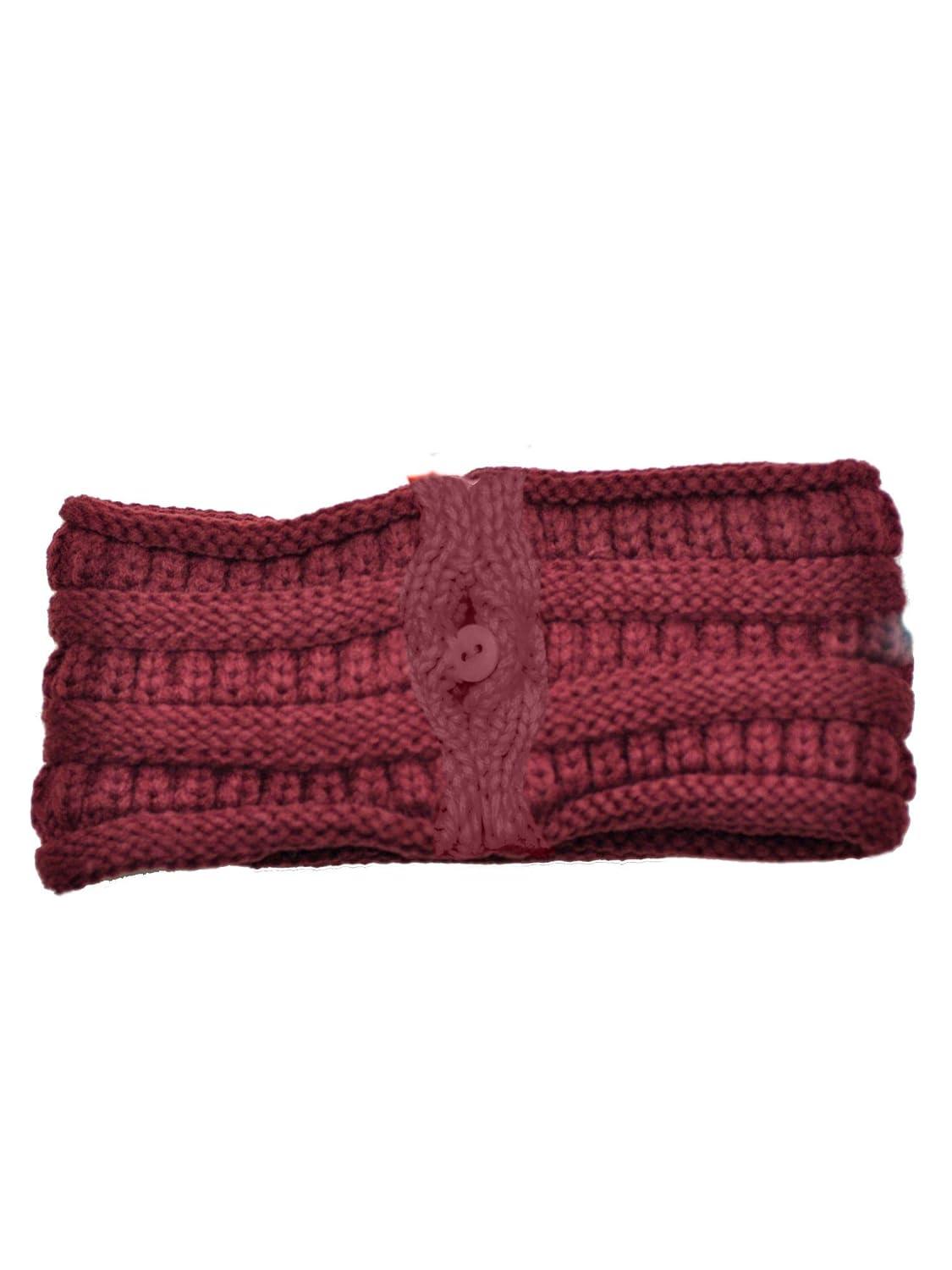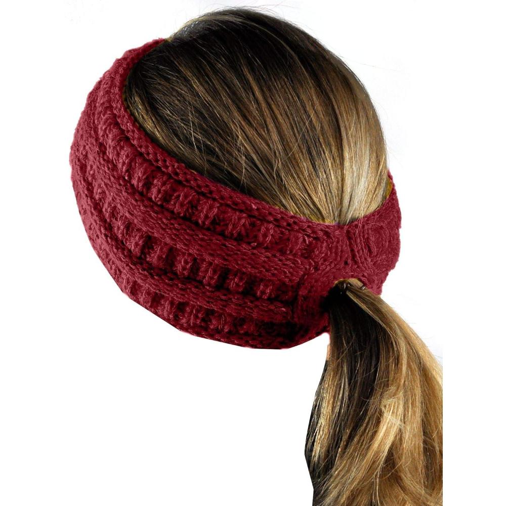 C.C Cable Knit Fuzzy Lined Ear Warmer Ponytail Pony Headband, Black(Maroon)