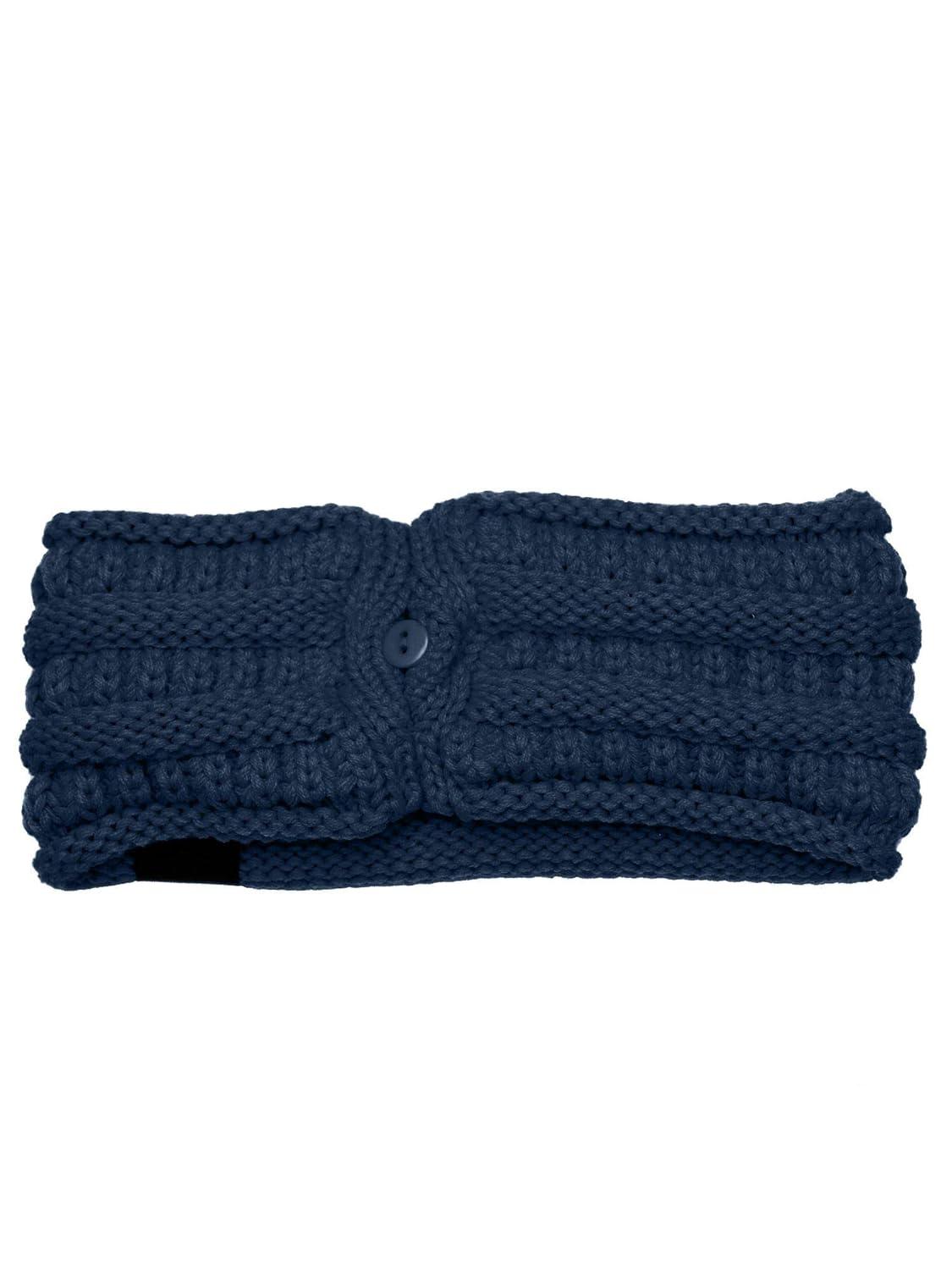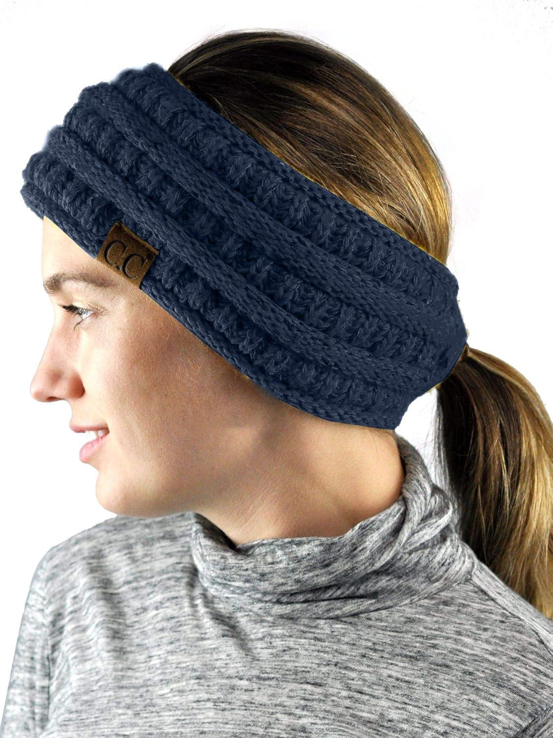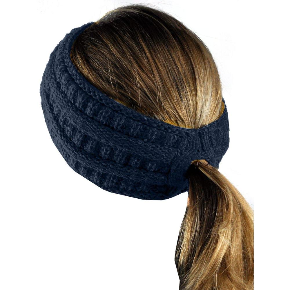C.C Cable Knit Fuzzy Lined Ear Warmer Ponytail Pony Headband, Black(Navy)