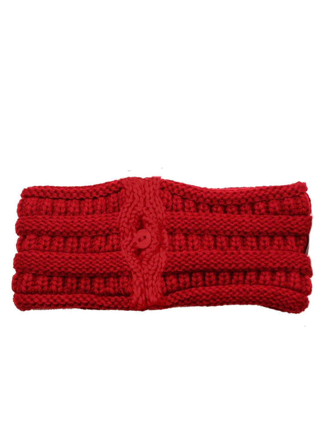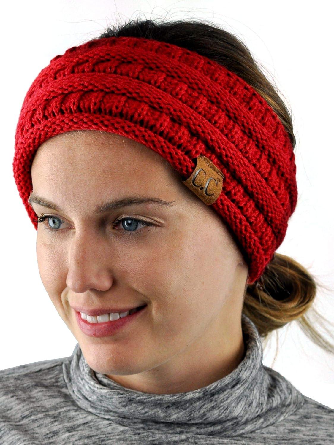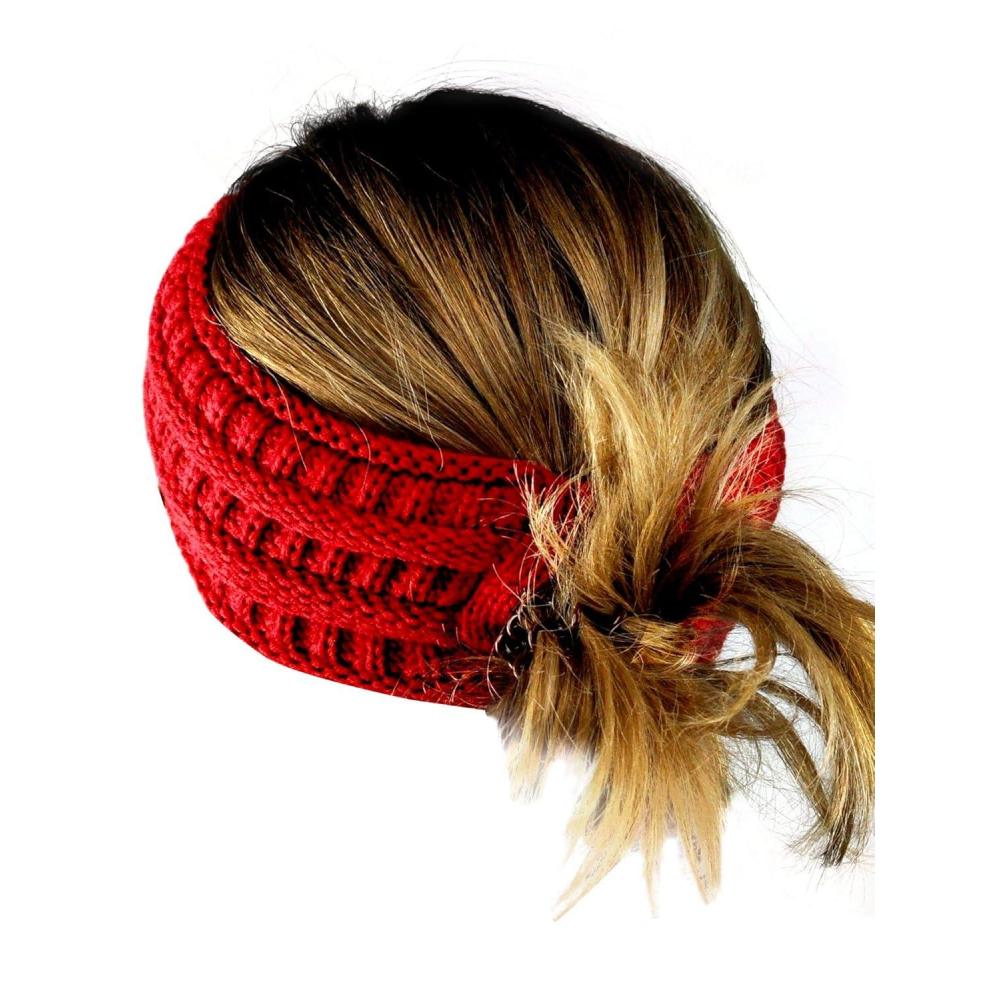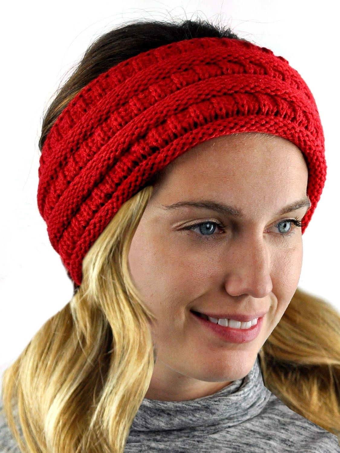 C.C Cable Knit Fuzzy Lined Ear Warmer Ponytail Pony Headband, Black(Red)