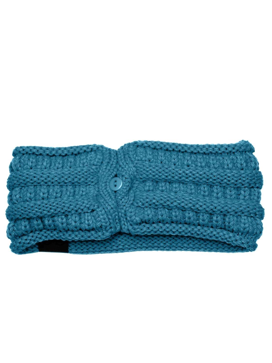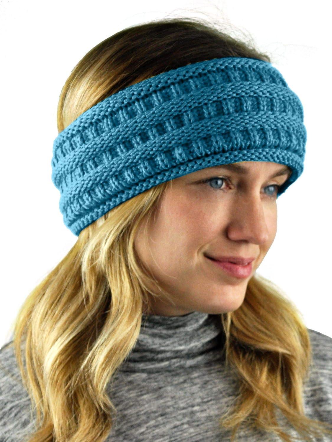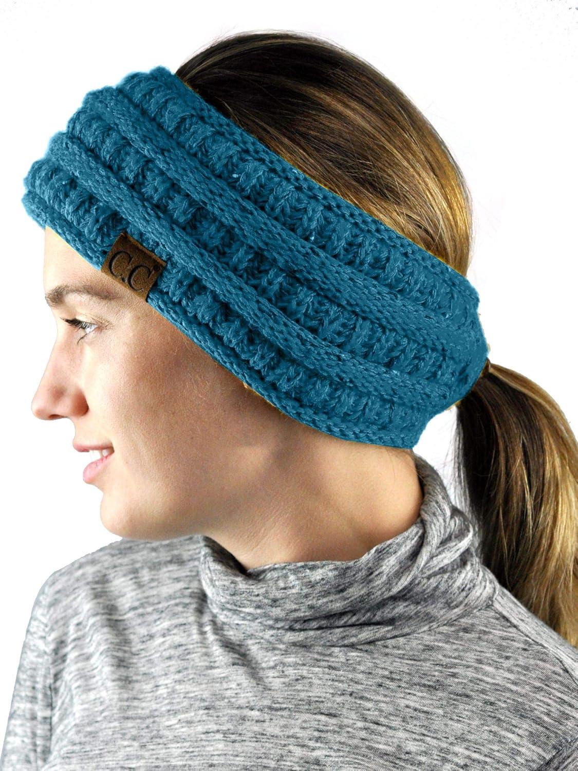 C.C Cable Knit Fuzzy Lined Ear Warmer Ponytail Pony Headband, Black(Teal)