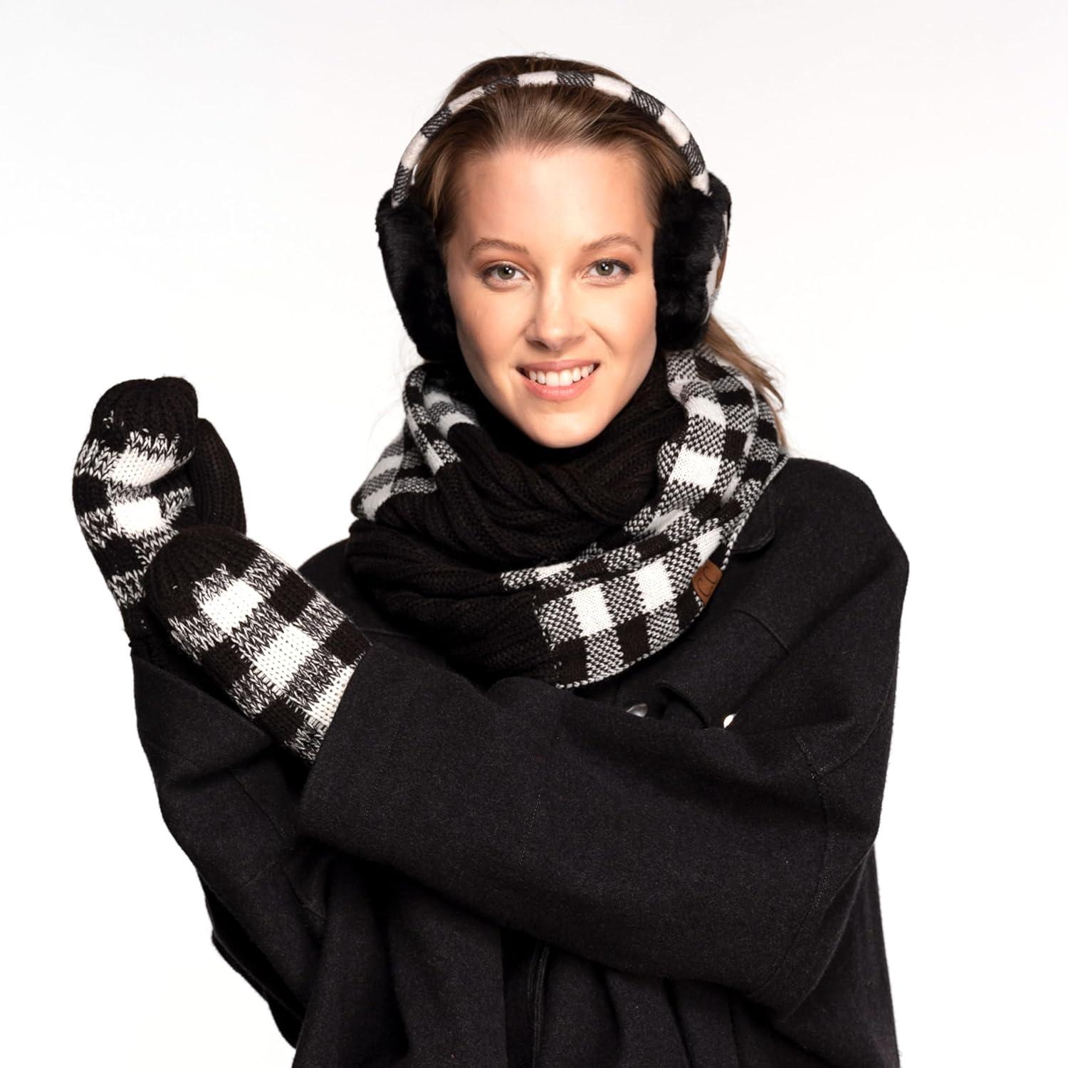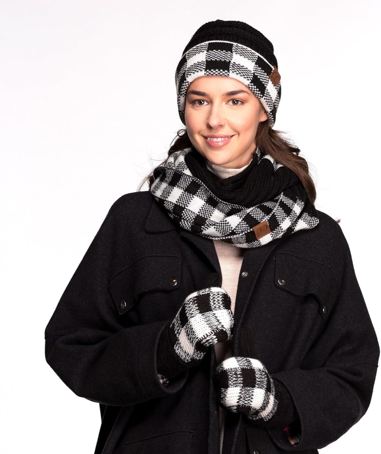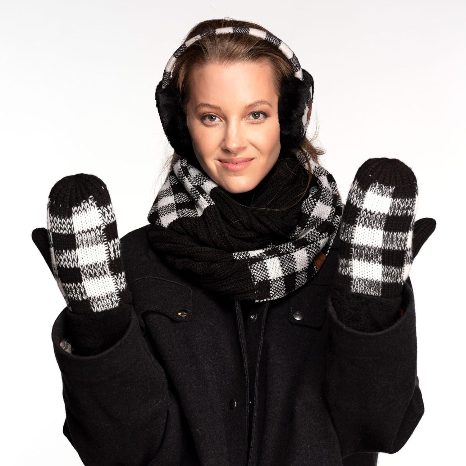 C.C CC Super Thick Fuzzy Fleeced Lined Warm Winter Knitted Mittens Gloves(Buffalo Plaid Black/White)