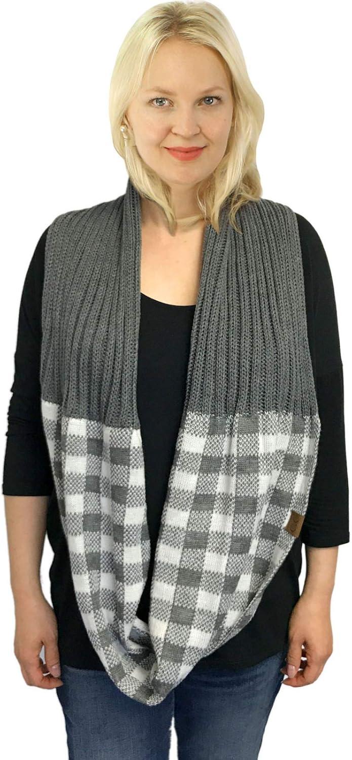 C.C CC Winter Soft Matching Unisex Chunky Knit Cowl Loop Infinity Scarf(Buffalo Plaid Dk. Melange Gray/White)