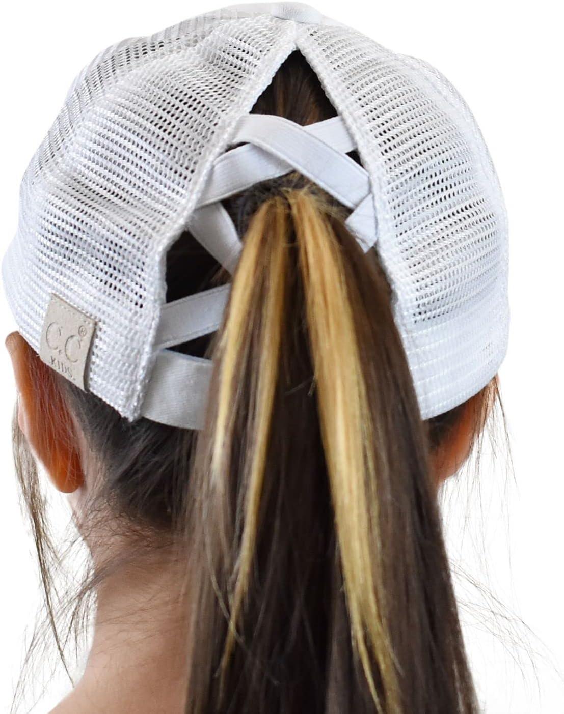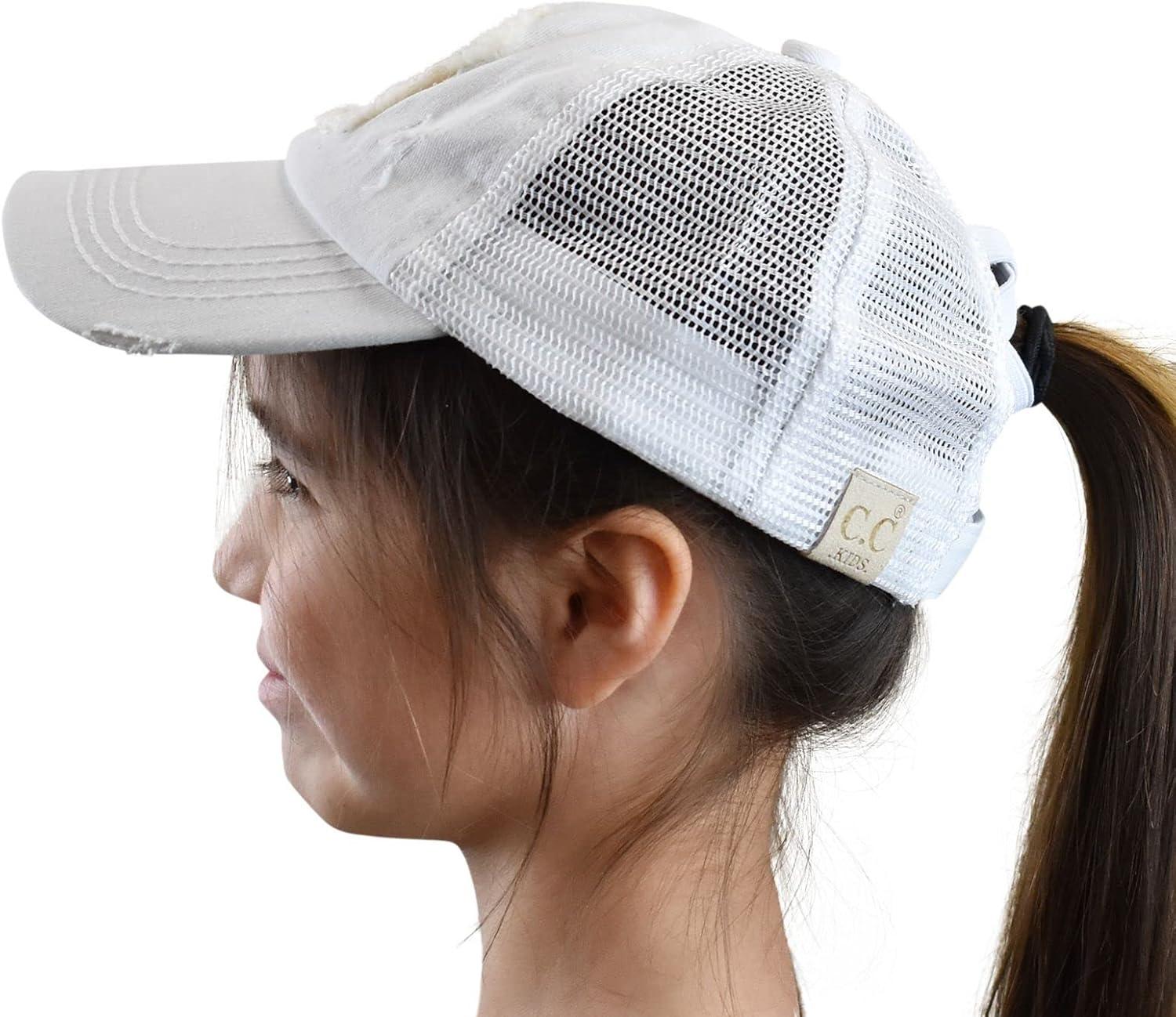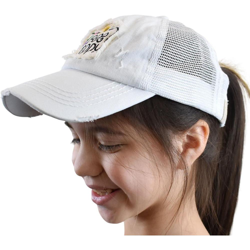 C.C. Childrens’ Kids’ Girls’ Criss Cross High Bun Adjustable Mesh Trucker Baseball Cap(Bee Happy White)