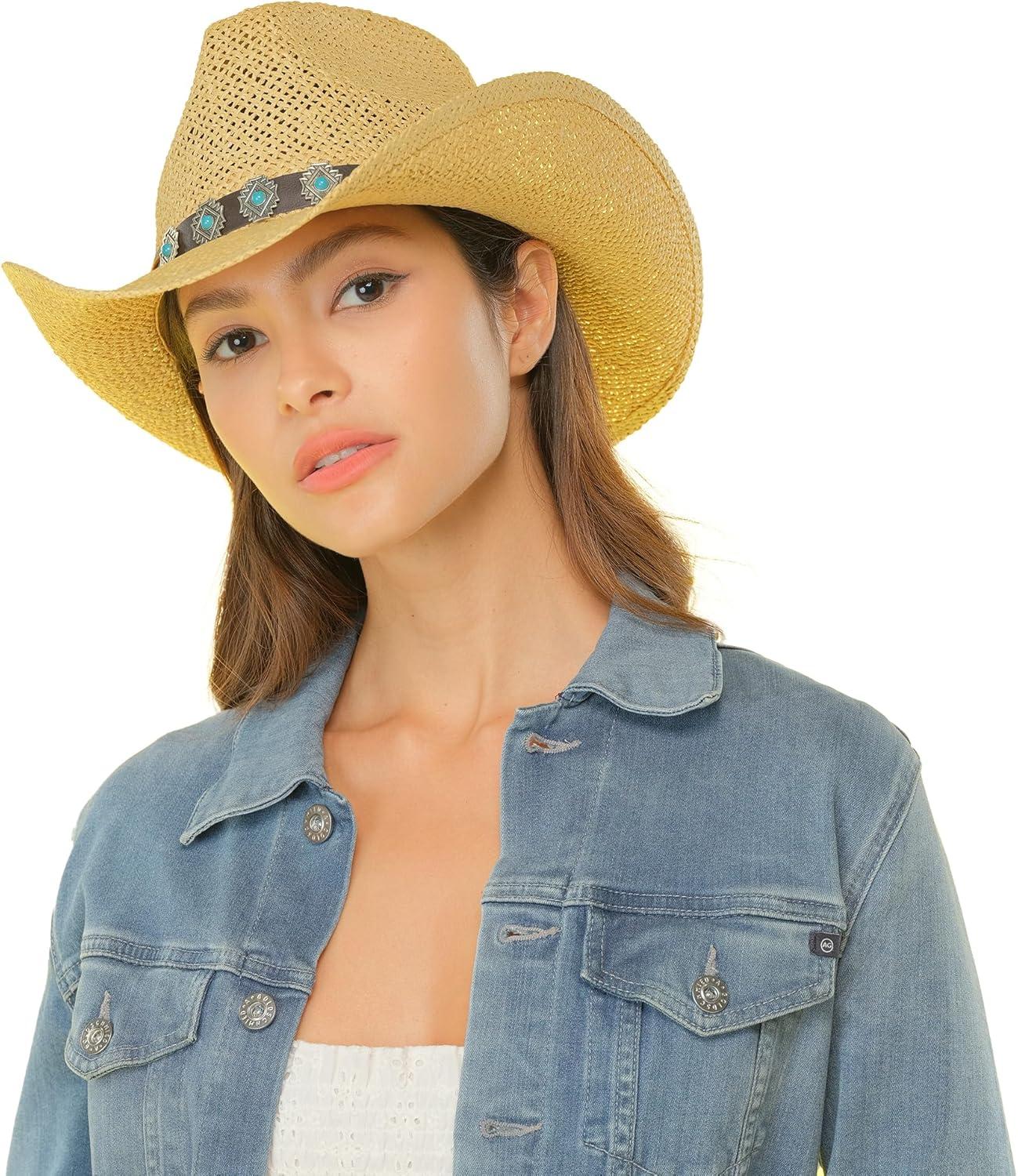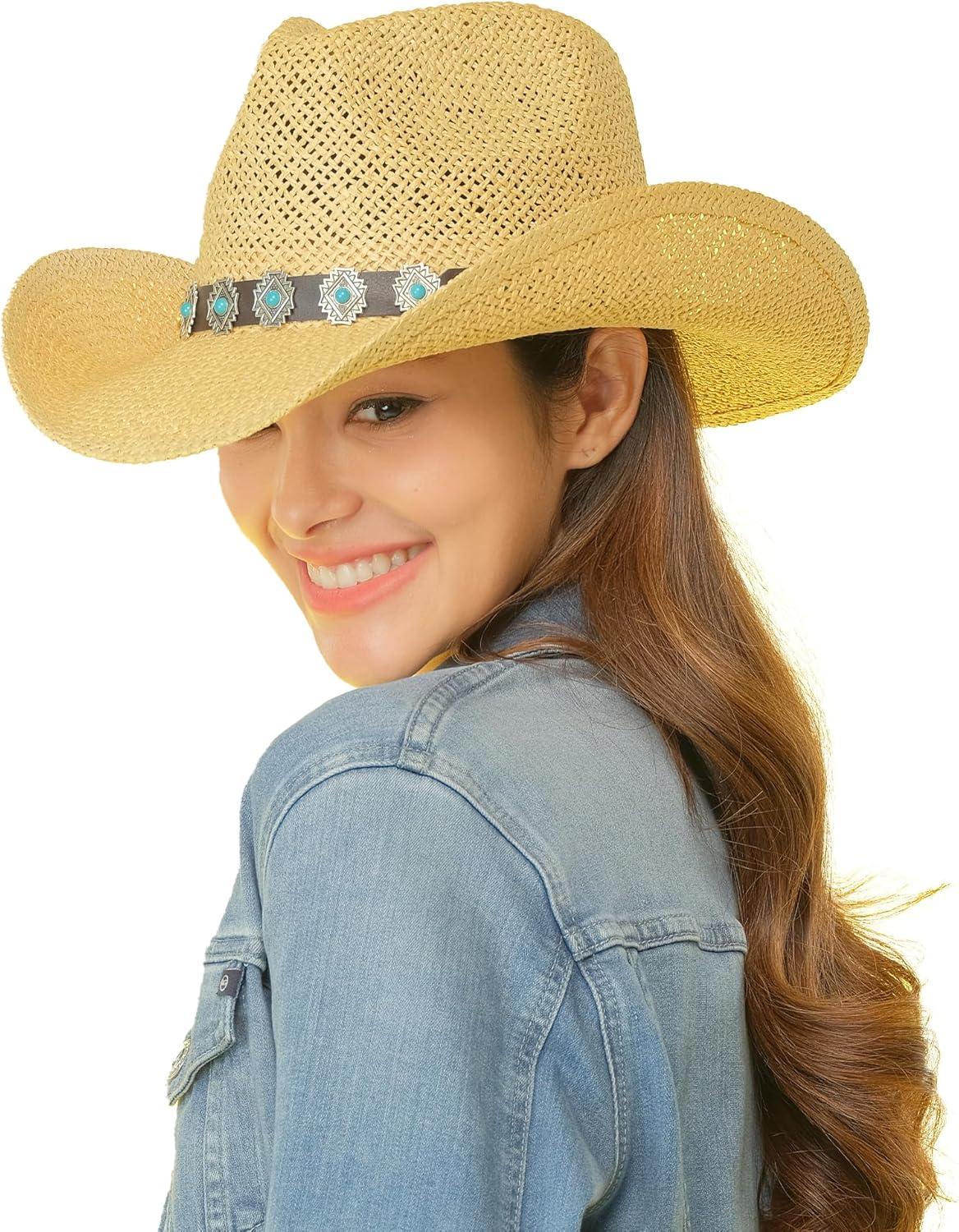 imageCC Classic Western Wide Roll up Brim Turquoise Charm Trim Band Cowboy Cowgirl HatNatural
