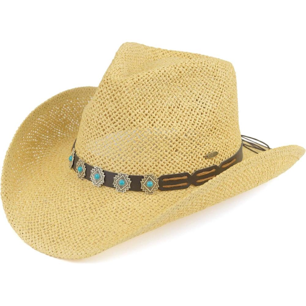 C.C Classic Western Wide Roll up Brim Turquoise Charm Trim Band Cowboy Cowgirl Hat(Natural)