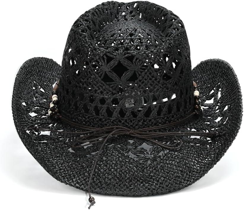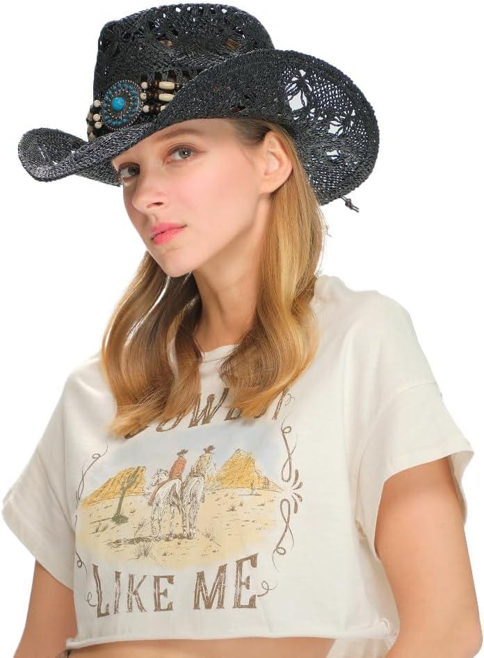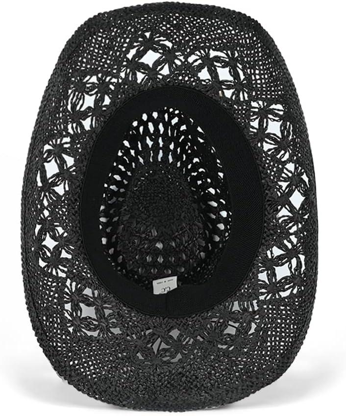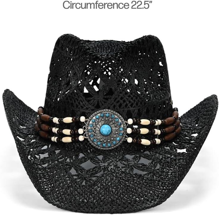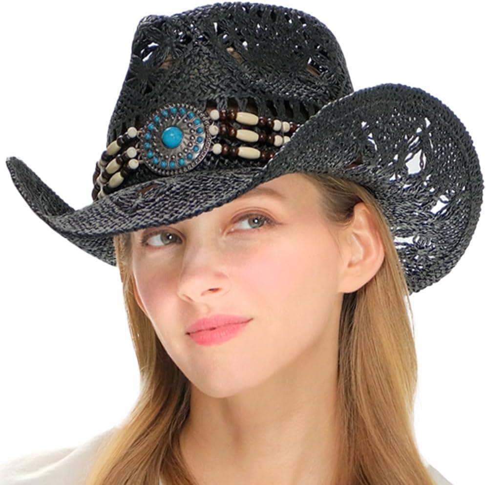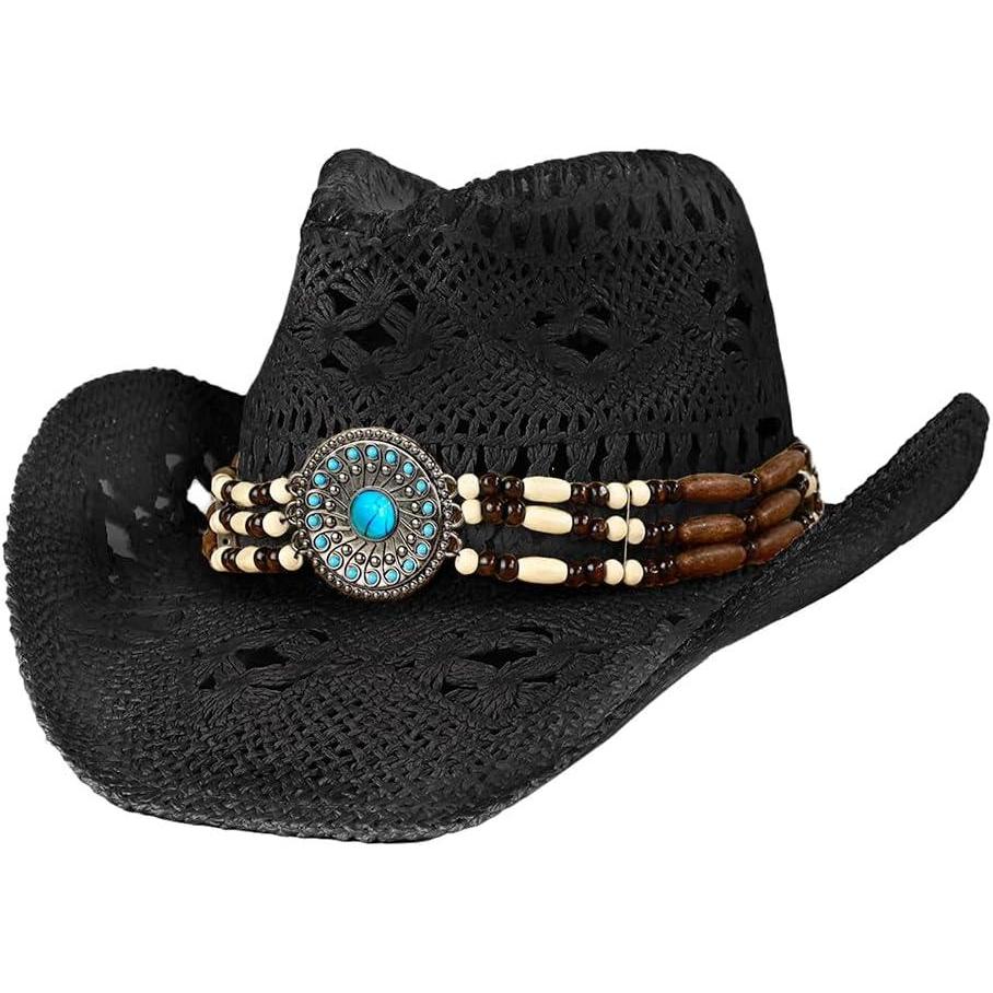 C.C Classic Western Wide Roll up Brim Turquoise Charm Trim Band Cowboy Cowgirl Hat(Open Weaved_black)