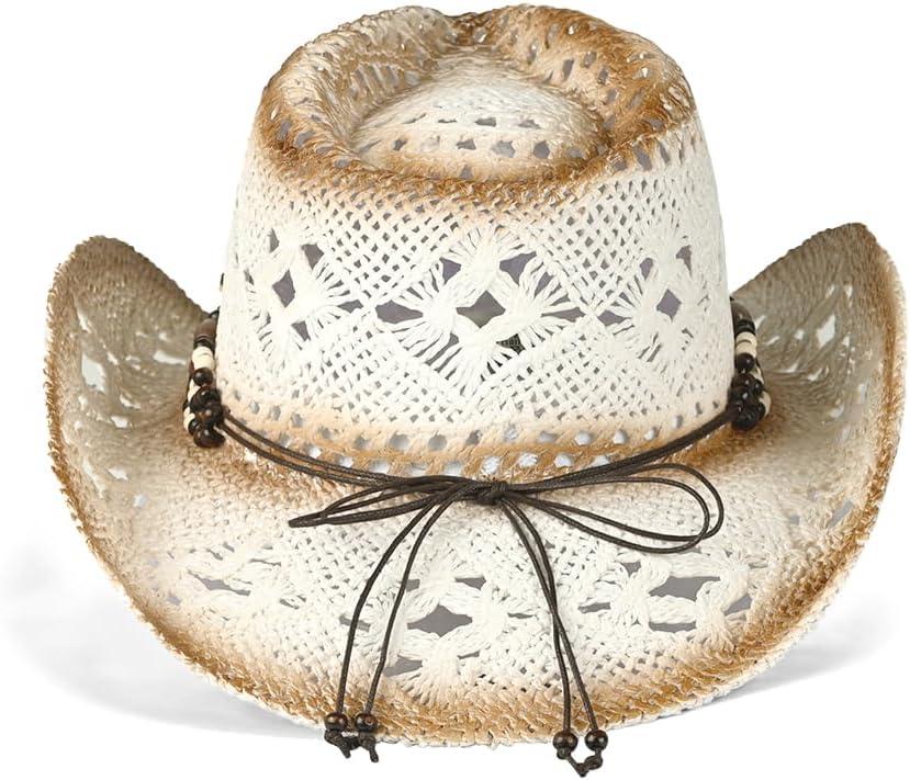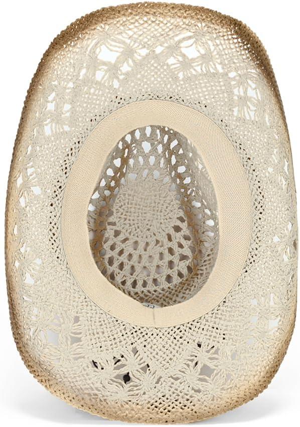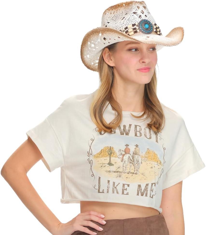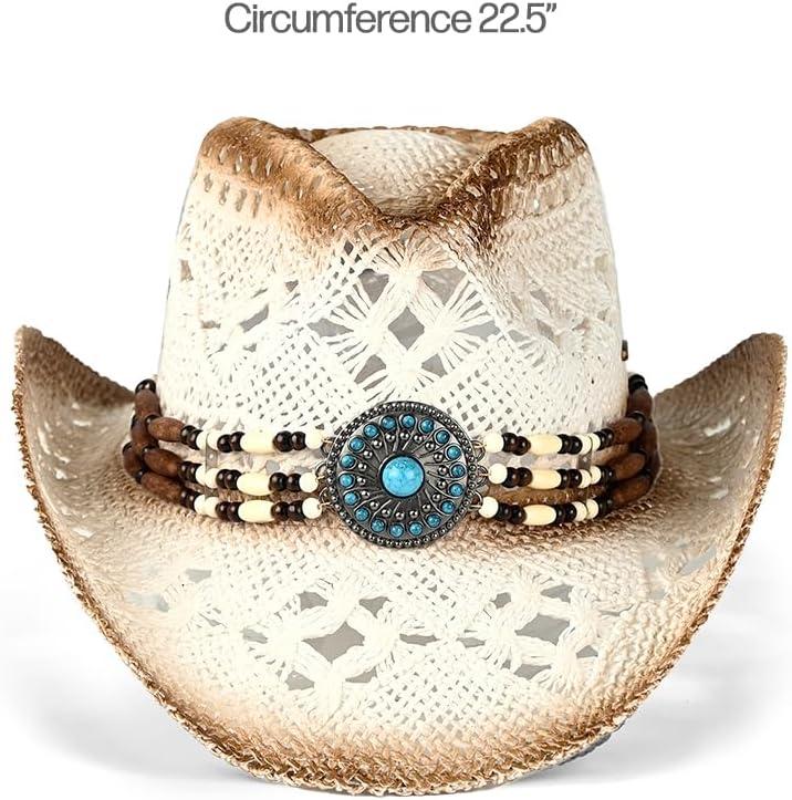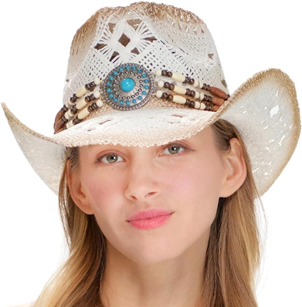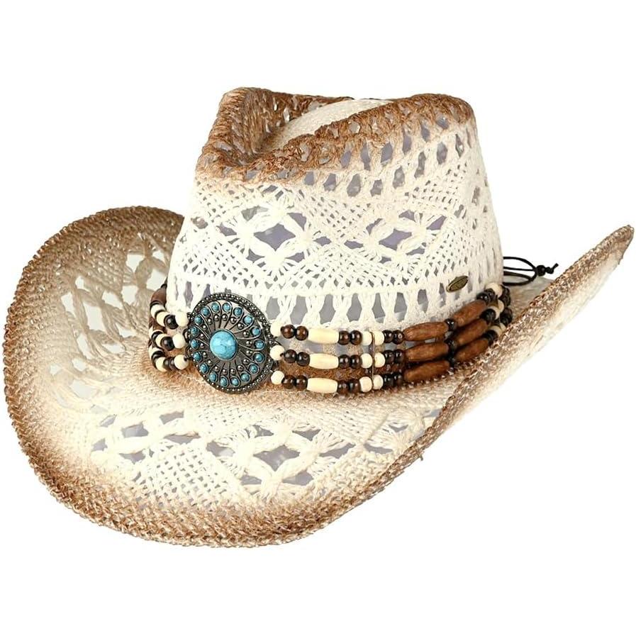 C.C Classic Western Wide Roll up Brim Turquoise Charm Trim Band Cowboy Cowgirl Hat(Open Weaved_ivory)