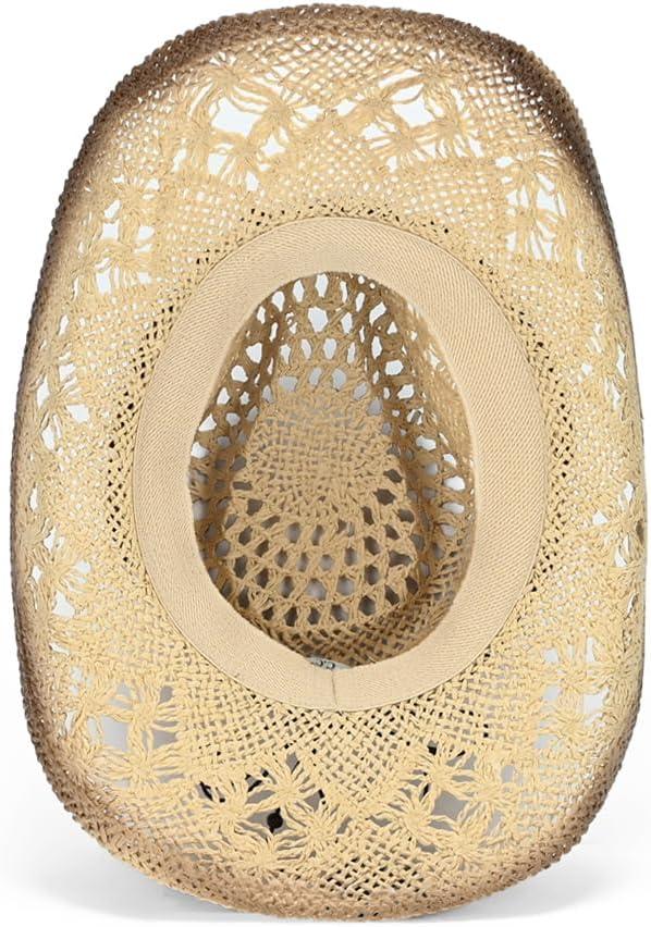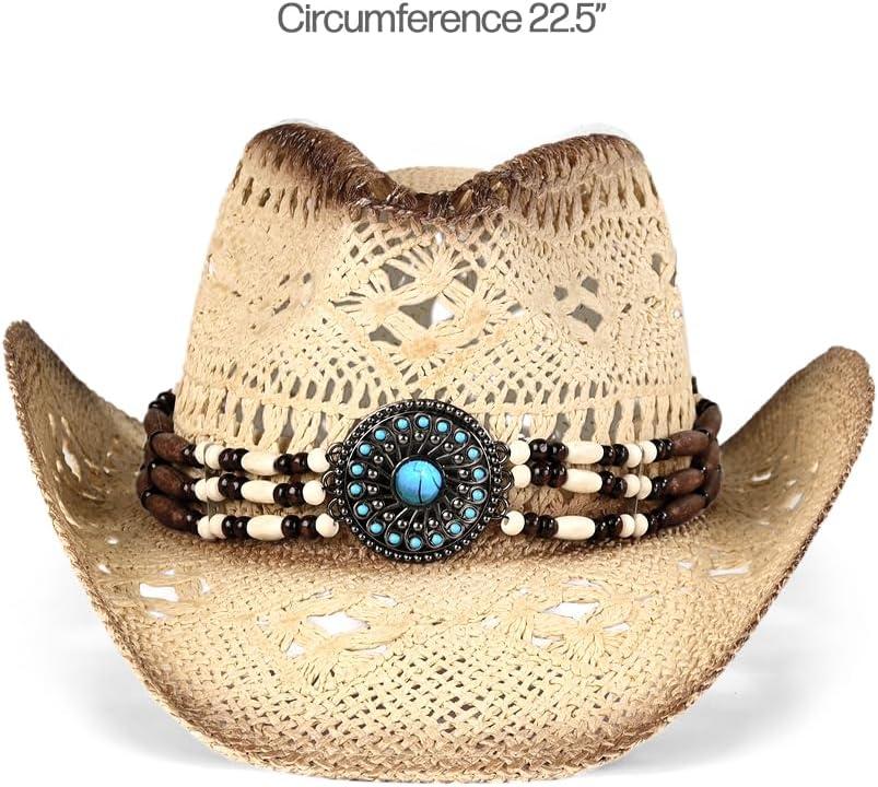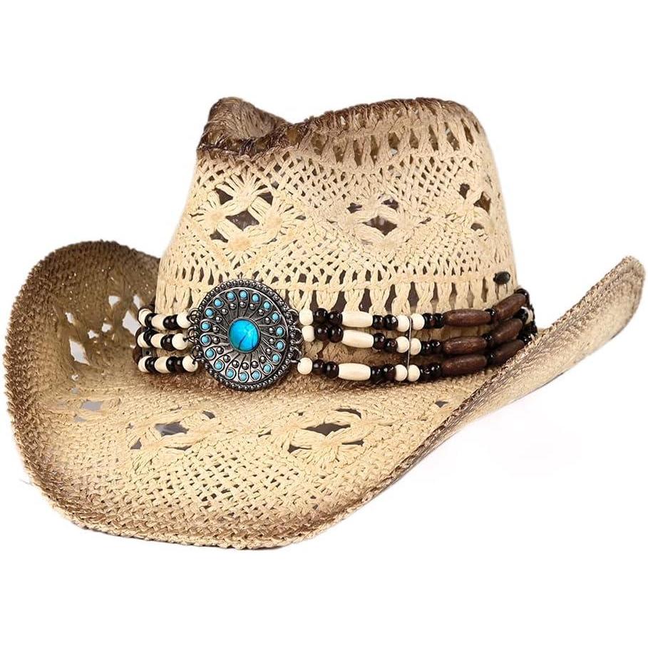 C.C Classic Western Wide Roll up Brim Turquoise Charm Trim Band Cowboy Cowgirl Hat(Open Weaved_natural)