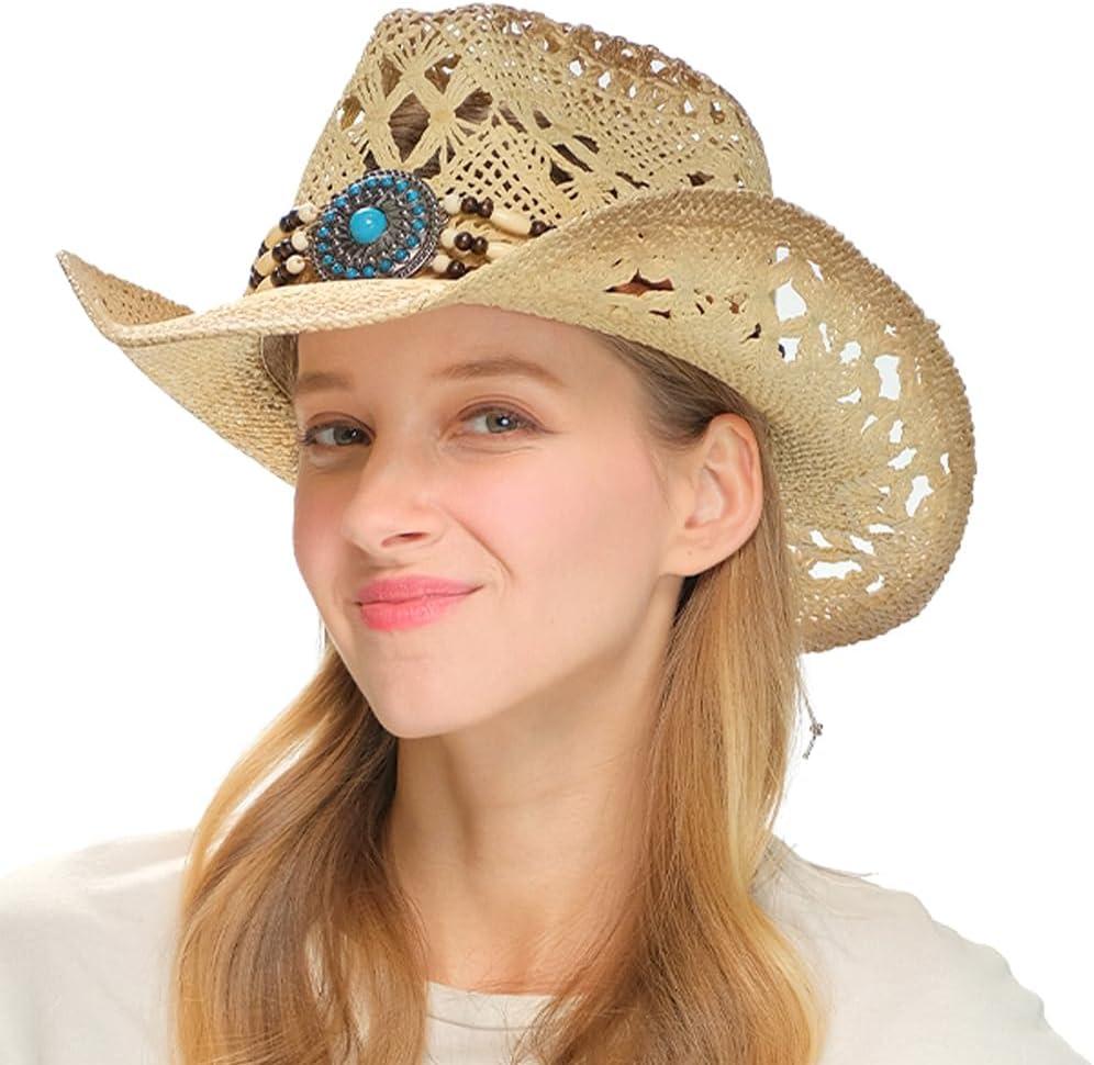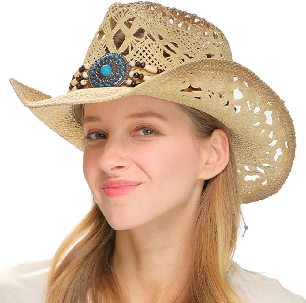 imageCC Classic Western Wide Roll up Brim Turquoise Charm Trim Band Cowboy Cowgirl HatOpen Weavednatural