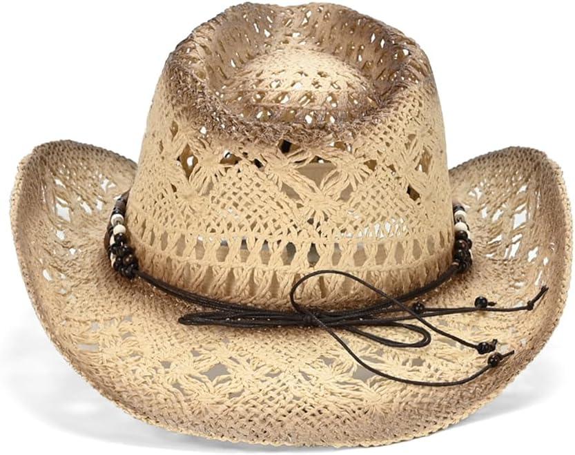 C.C Classic Western Wide Roll up Brim Turquoise Charm Trim Band Cowboy Cowgirl Hat(Open Weaved_ivory)