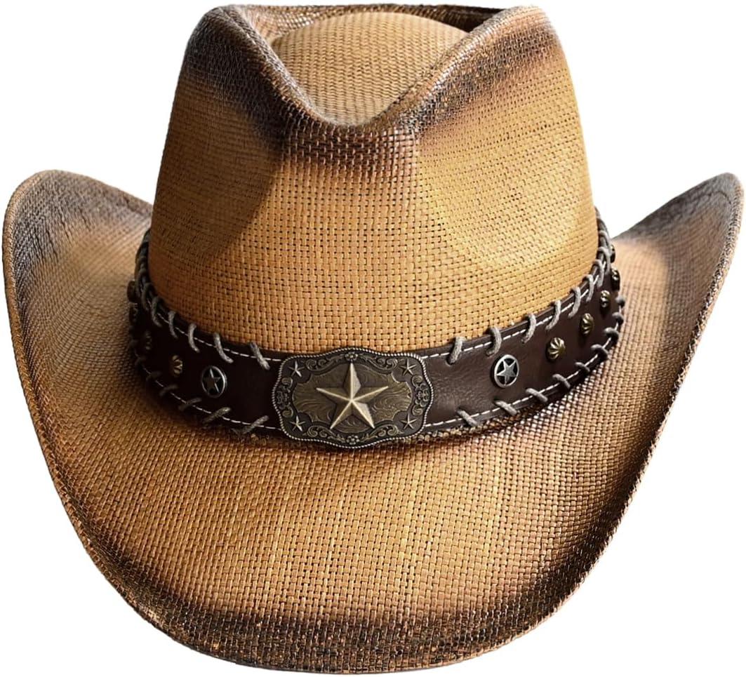 C.C Classic Western Wide Roll up Brim Turquoise Charm Trim Band Cowboy Cowgirl Hat(Tea-stain_natural)
