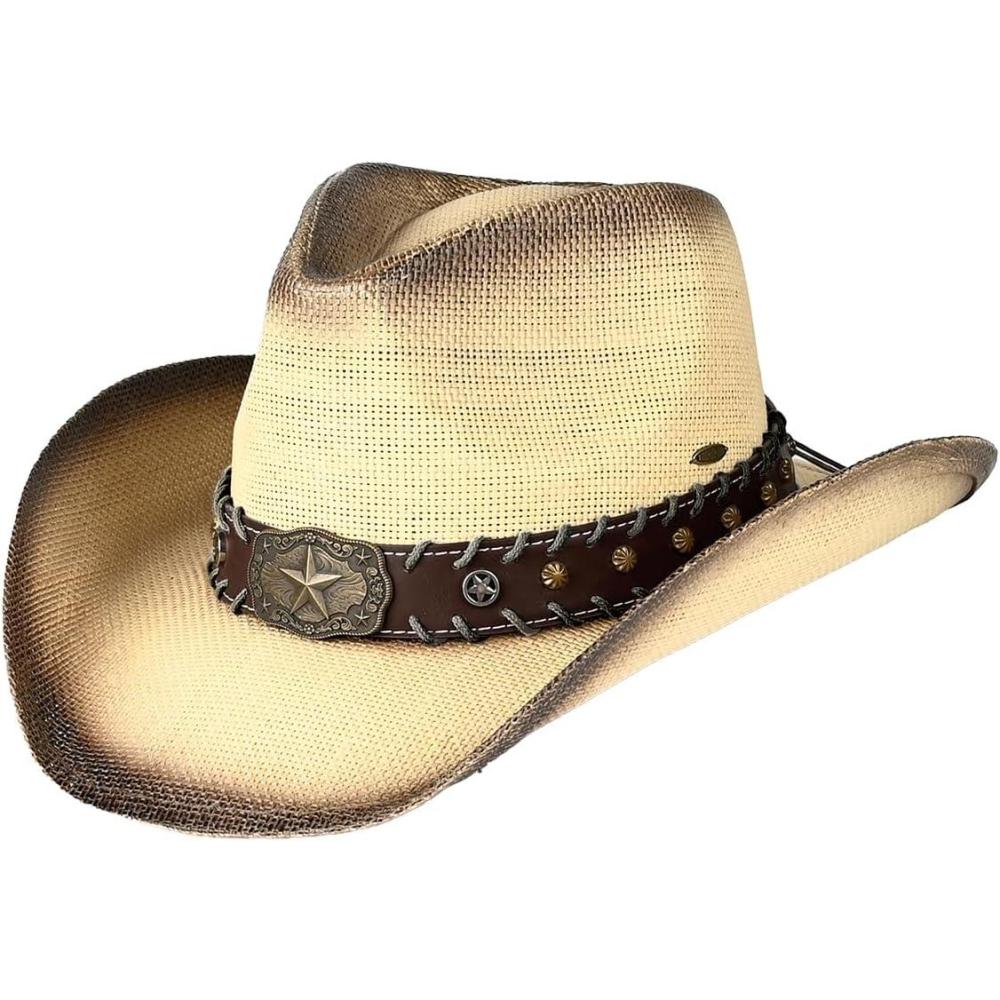 C.C Classic Western Wide Roll up Brim Turquoise Charm Trim Band Cowboy Cowgirl Hat(Tea-stain_natural)