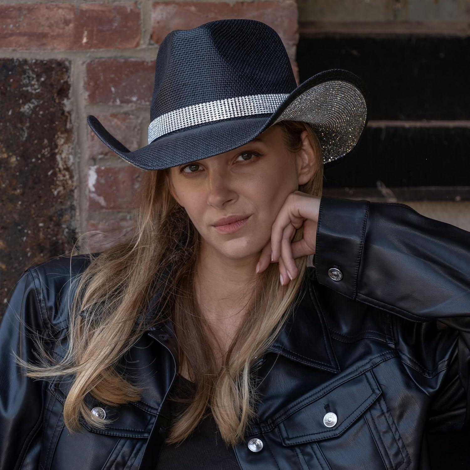 imageCC Classic Western Wide Roll up Brim Turquoise Charm Trim Band Cowboy Cowgirl HatUnder Brim Rhinestoneblack