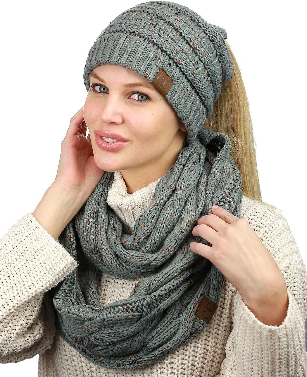 C.C Colorful Confetti BeanieTail Messy High Bun Cable Knit Beanie and Infinity Loop Scarf Set(Natural Gray)