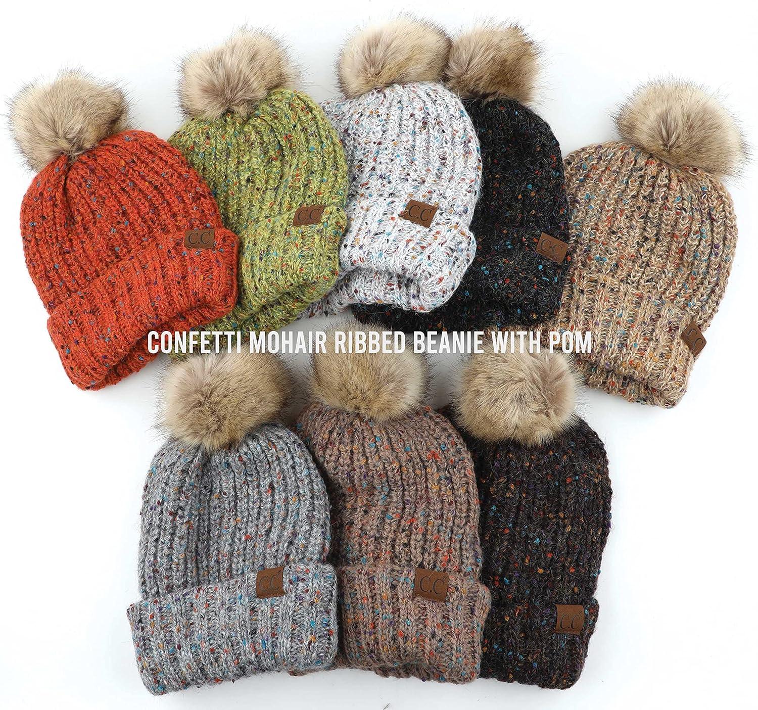 C.C Exclusives Fuzzy Lined Knit Fur Pom Beanie Hat (YJ-820)(A Confetti Mohair Ribbed-lt Grey)