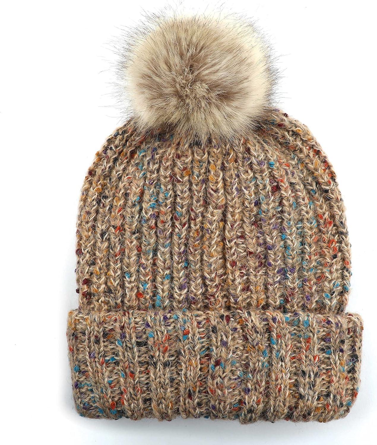 C.C Exclusives Fuzzy Lined Knit Fur Pom Beanie Hat (YJ-820)(A Confetti Mohair Ribbed-taupe)
