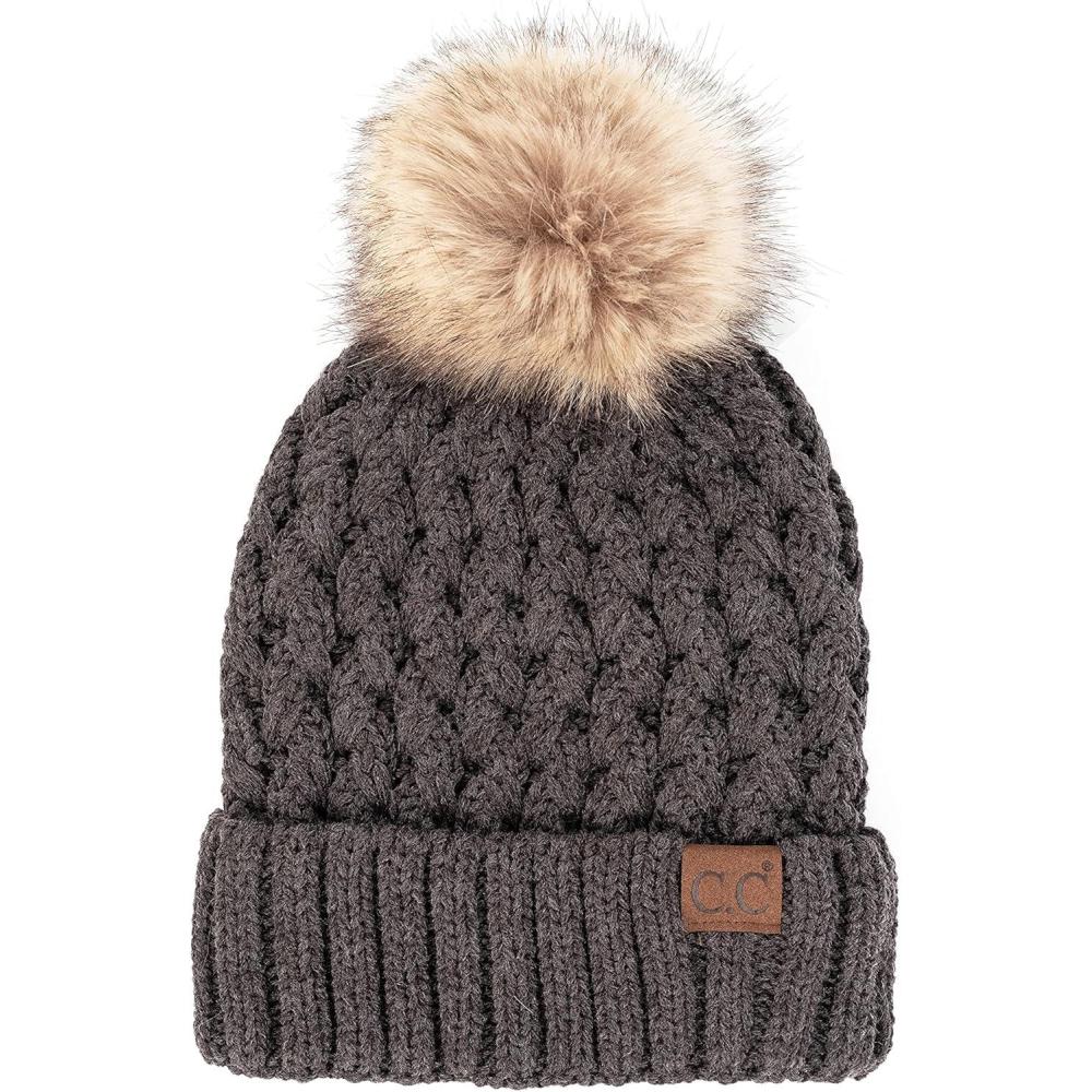 C.C Exclusives Fuzzy Lined Knit Fur Pom Beanie Hat (YJ-820)(A Lattice Crossover Stitch-charcoal)
